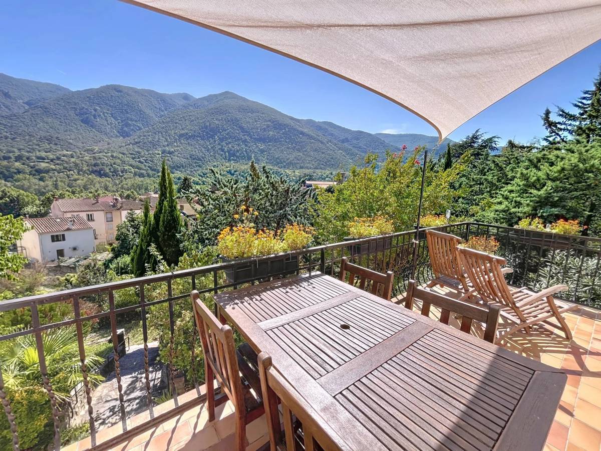 On the edge of the charming medieval village of Arles-sur-Tech, this lovely villa enjoys spectacular views over the mountains and the village. Built in 1956 on the site of an old vineyard, it offers a peaceful setting and generous terraced grounds.