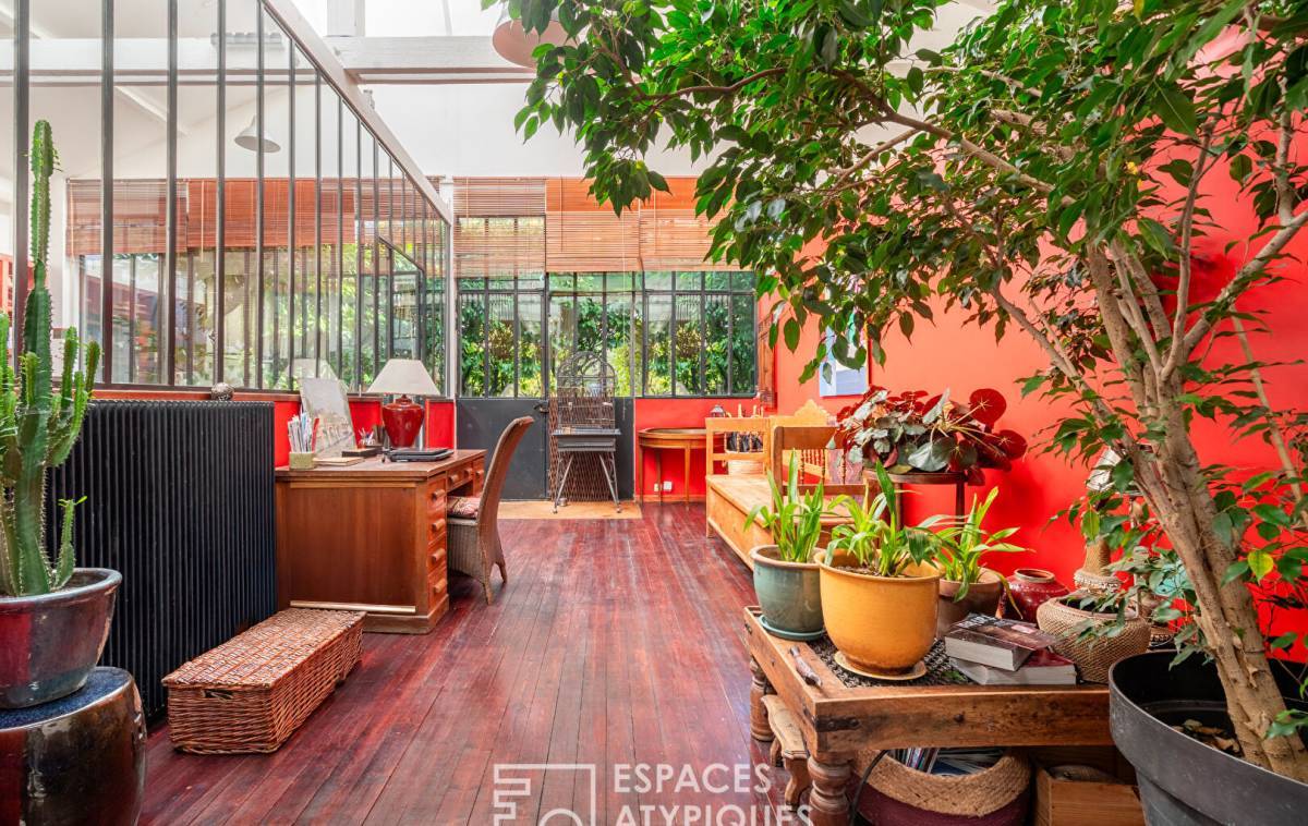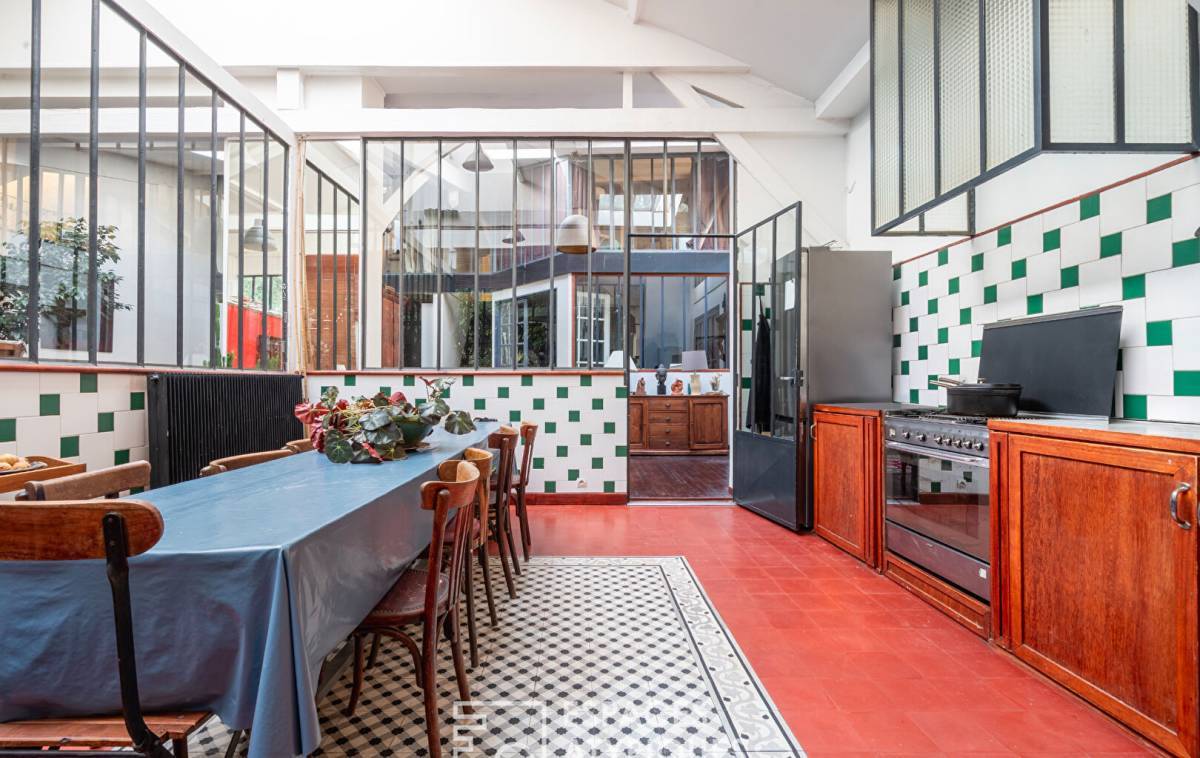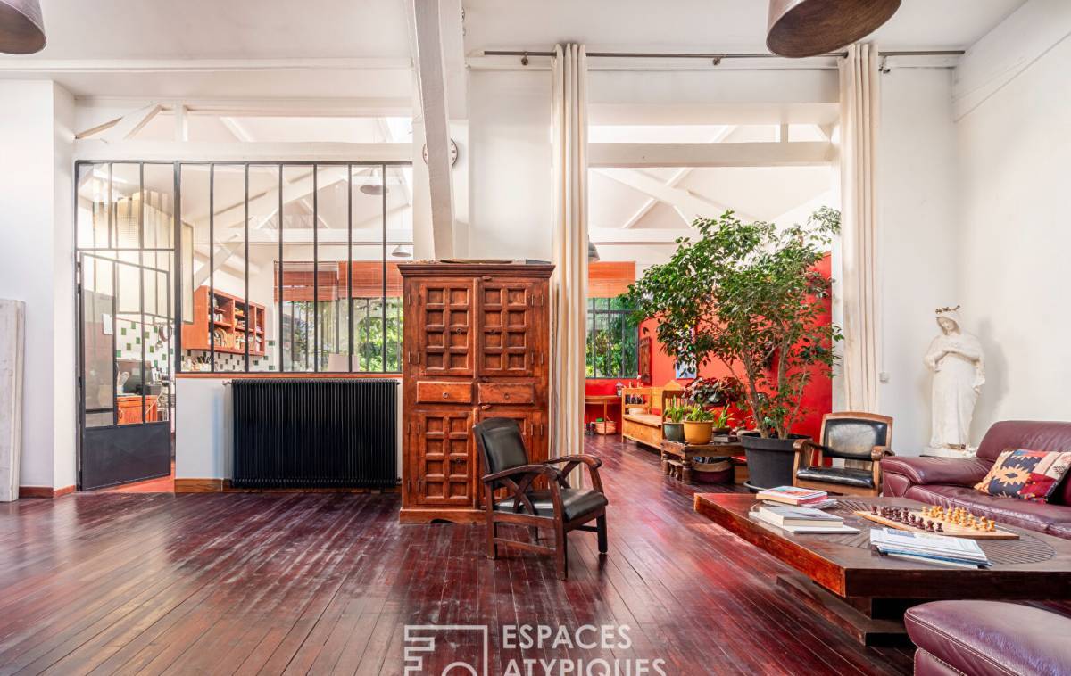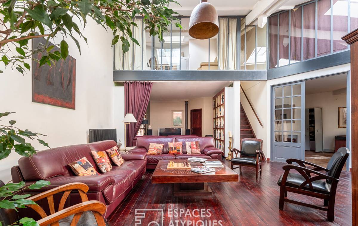 The numerous glass partitions, the old terracotta floor tiles (tomettes), the solid wood flooring, and the generous volumes give this family loft a unique character, blending authenticity, light, and an industrial workshop spirit.