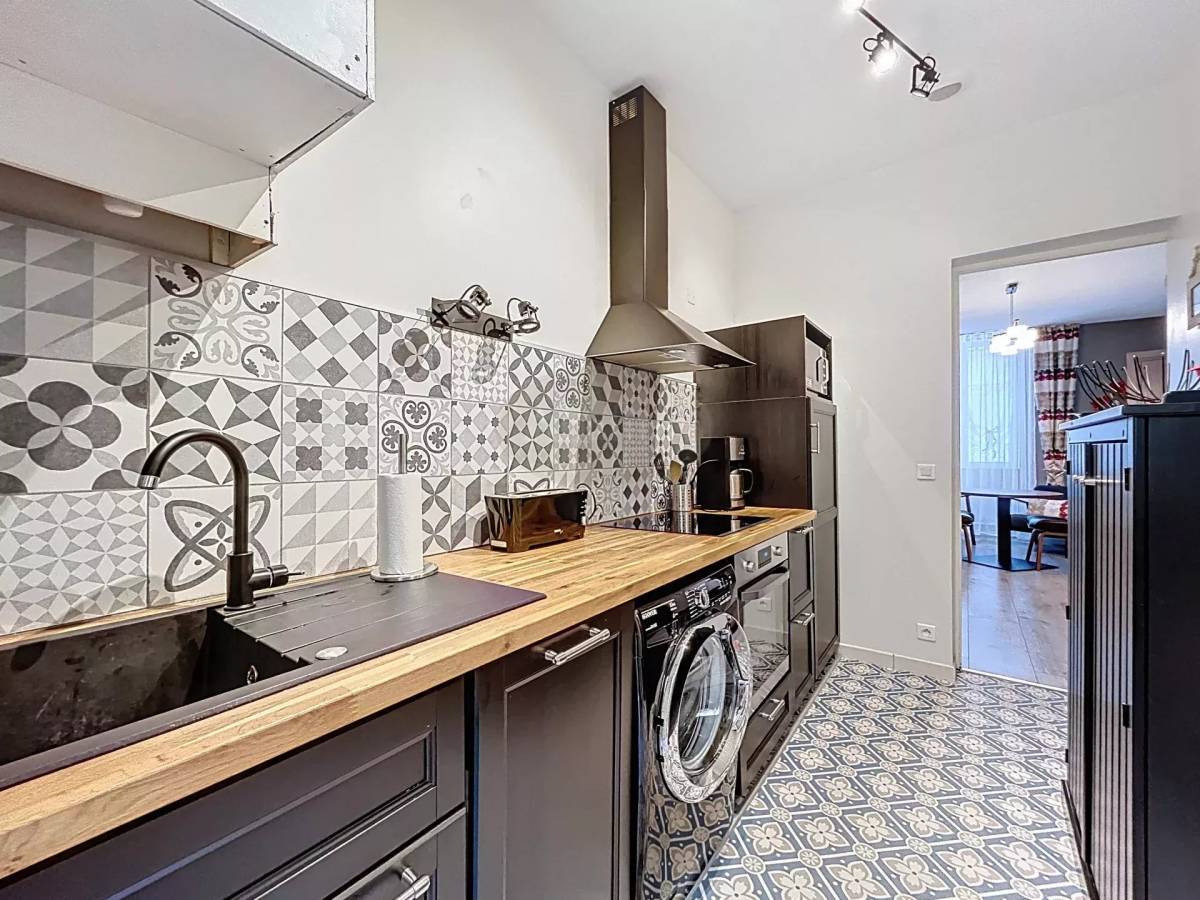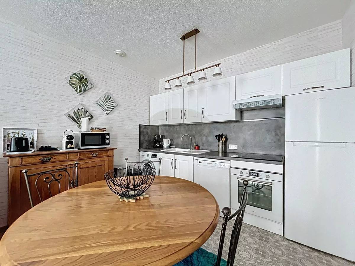 The apartment on the second floor measures 68.5 m² and is composed of a dining room that gives onto the kitchen, followed by a nice living room, two bedrooms, a shower-room and a separate toilet.