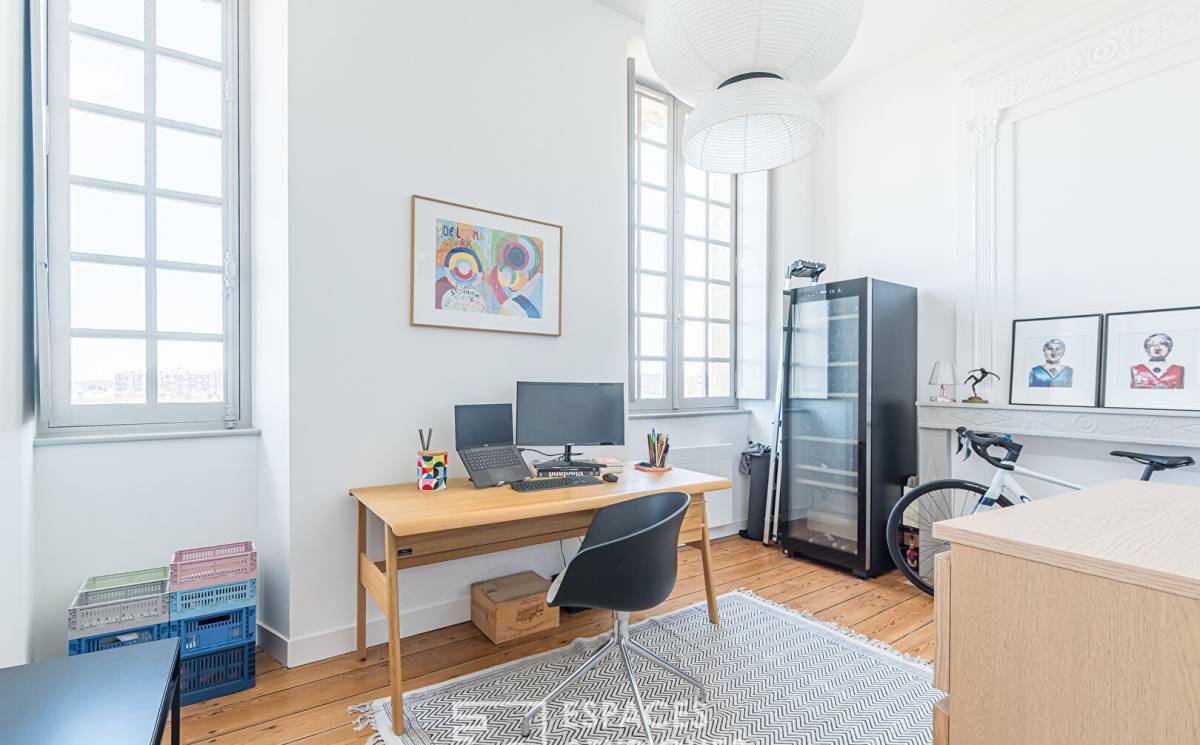 On the quays, 100 m from the Basilica of Saint-Michel, in a well-maintained stone building with elevator, this apartment located on the 3rd floor has been completely and tastefully renovated by its owners. From the entrance, the solid parquet flooring, the beautiful high ceilings and the furniture set the tone. On the left, you enter the living room with triple exposure made up of 3 distinct spaces: a first cozy living room near the fireplace offering a breathtaking view of the Garonne and some emblematic monuments of Bordeaux, a large dining room and a TV lounge.
