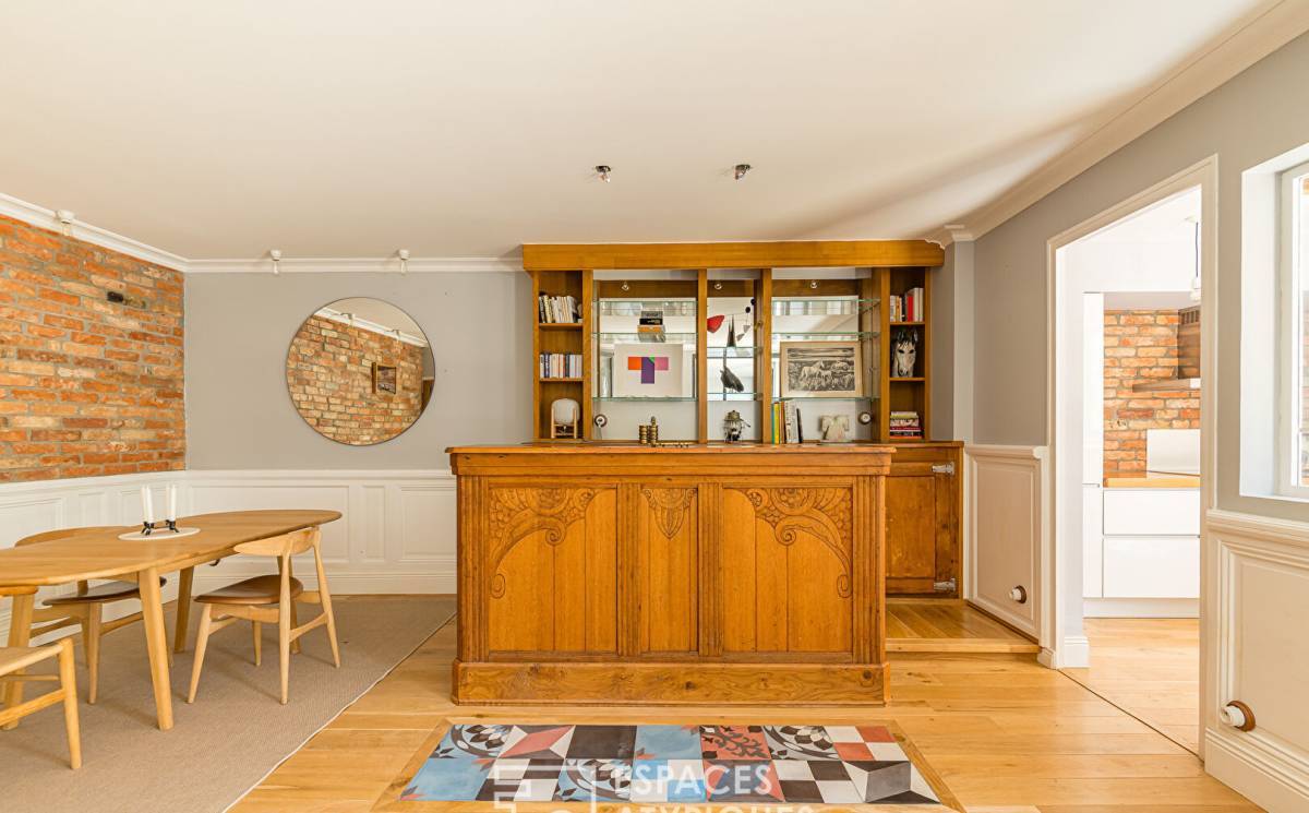 The ground floor of approximately 60 sqm opens onto a generously sized living area, where the living room, dining room, and separate kitchen coexist seamlessly. The kitchen, bathed in light, opens onto a 20 sqm planted patio: a secluded green setting, ideal for extending summer evenings. The high-quality materials, second-hand furniture, and decorative touches create a unique signature and a truly relaxed atmosphere.