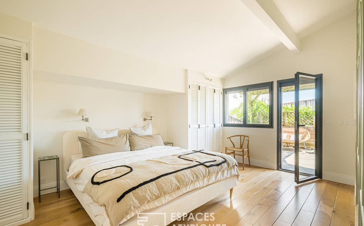 Upstairs, the sleeping area consists of two suites: the first, 20 sqm, includes a bathroom, a dressing room and a private terrace of 14 sqm decorated with a pergola, like a suspended cocoon. The second, 18 sqm, has its own shower room. A separate toilet completes each level.