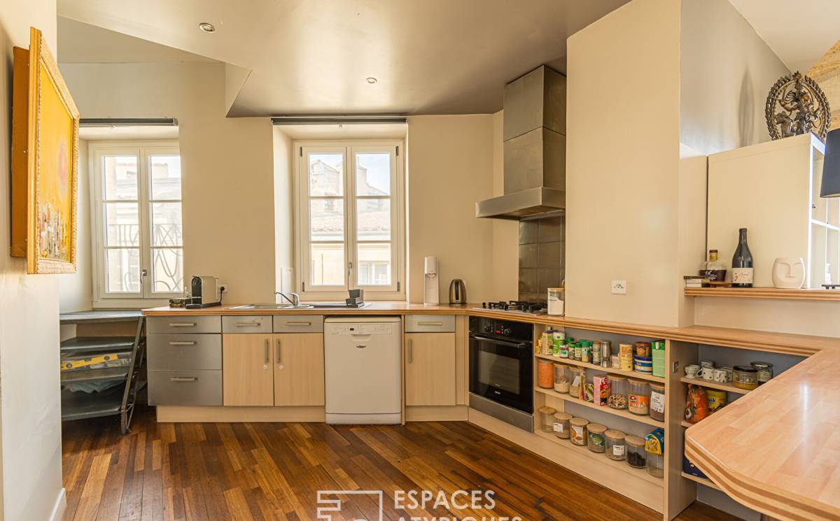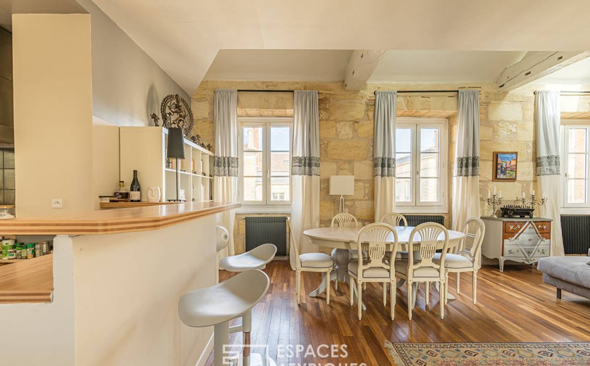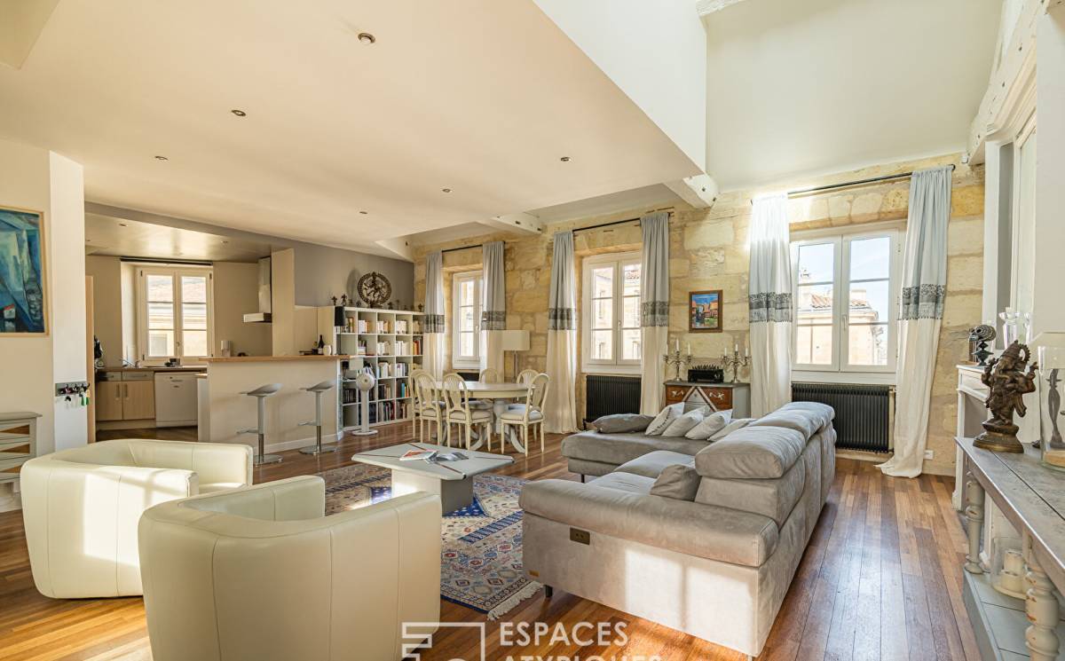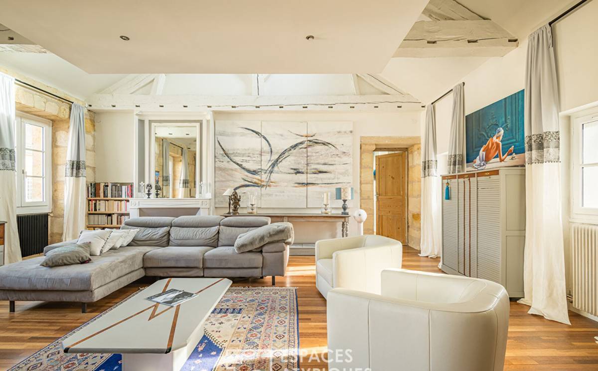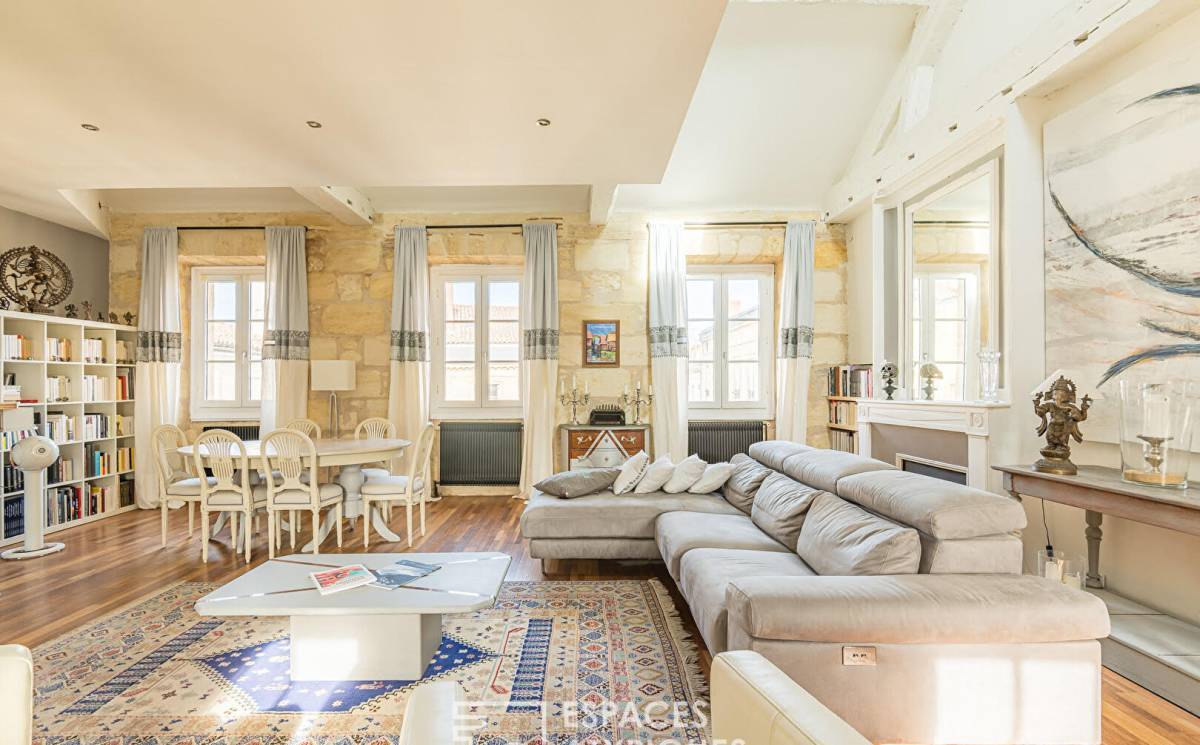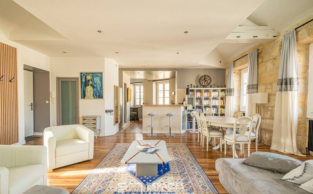 Located in a magnificent historic building just steps from the Porte de la Monnaie, on the second and top floor, this apartment of over 100 square meters offers a stunning living area, two bedrooms, and an office space.