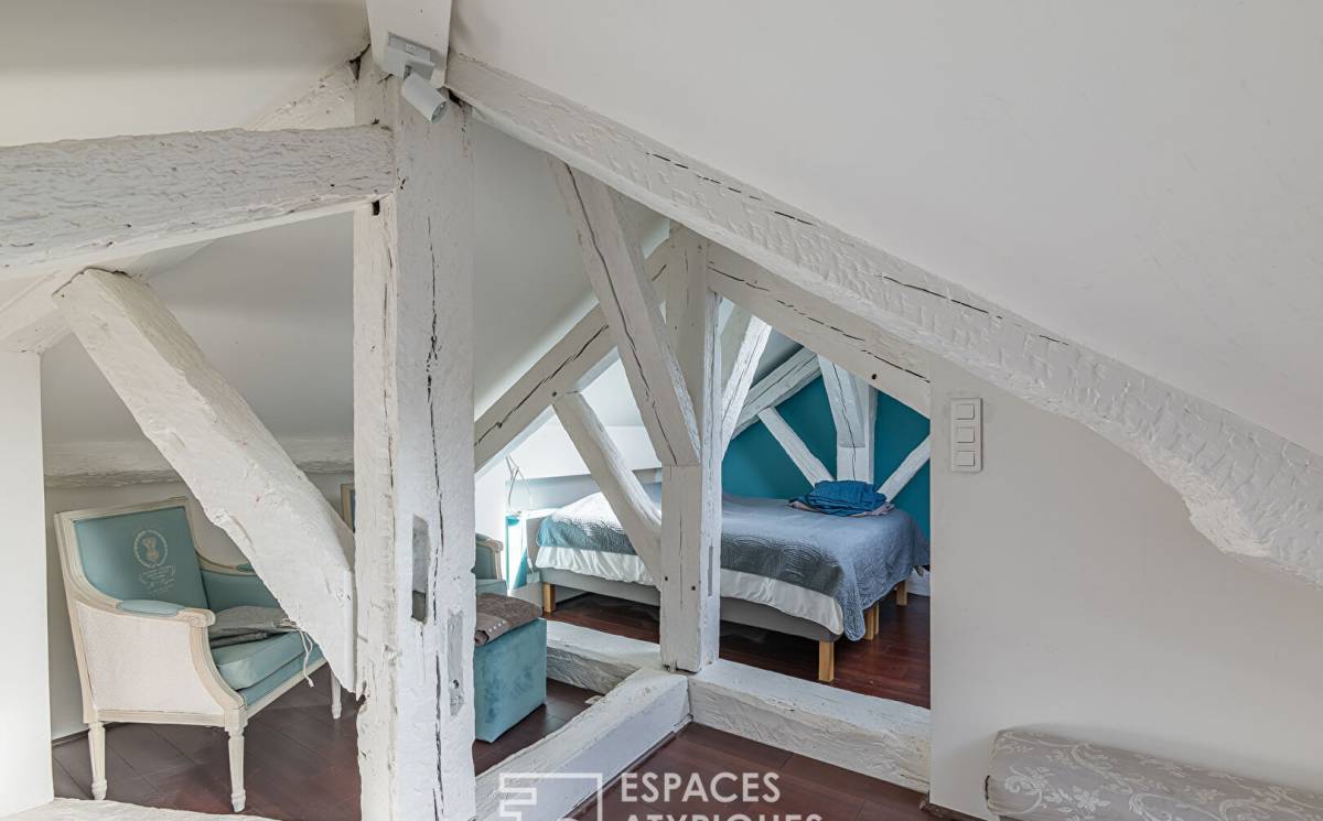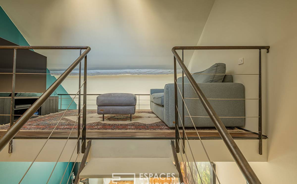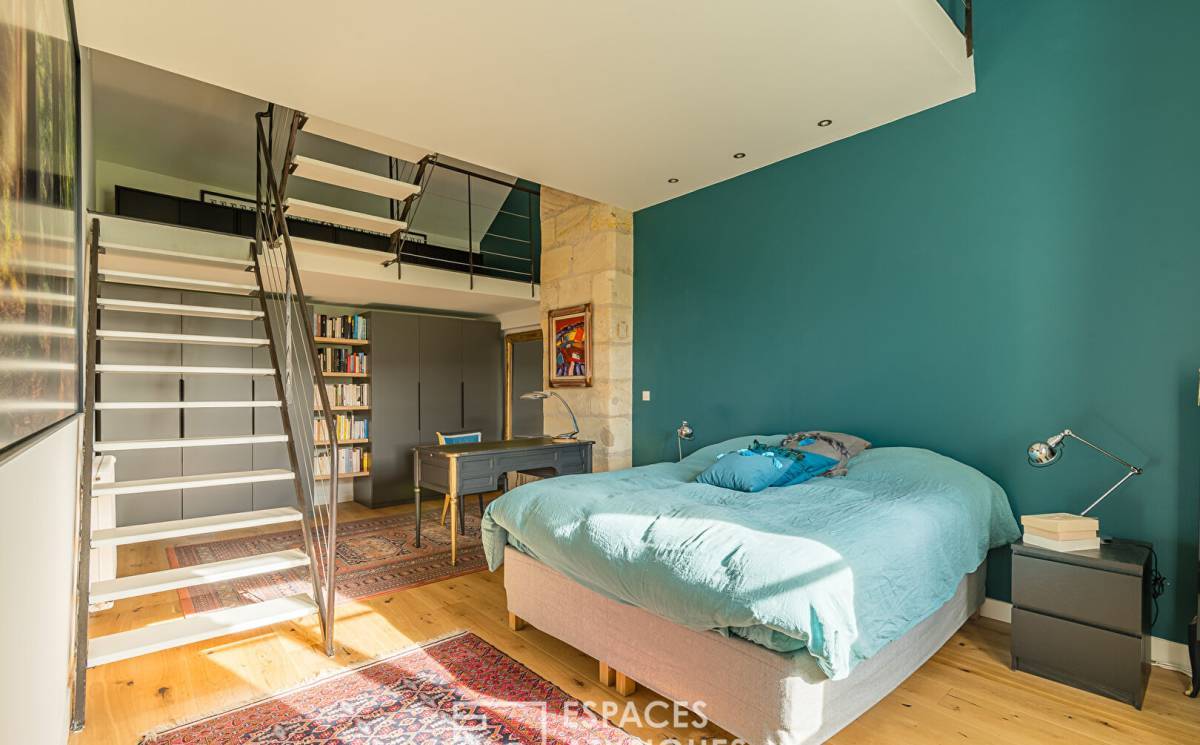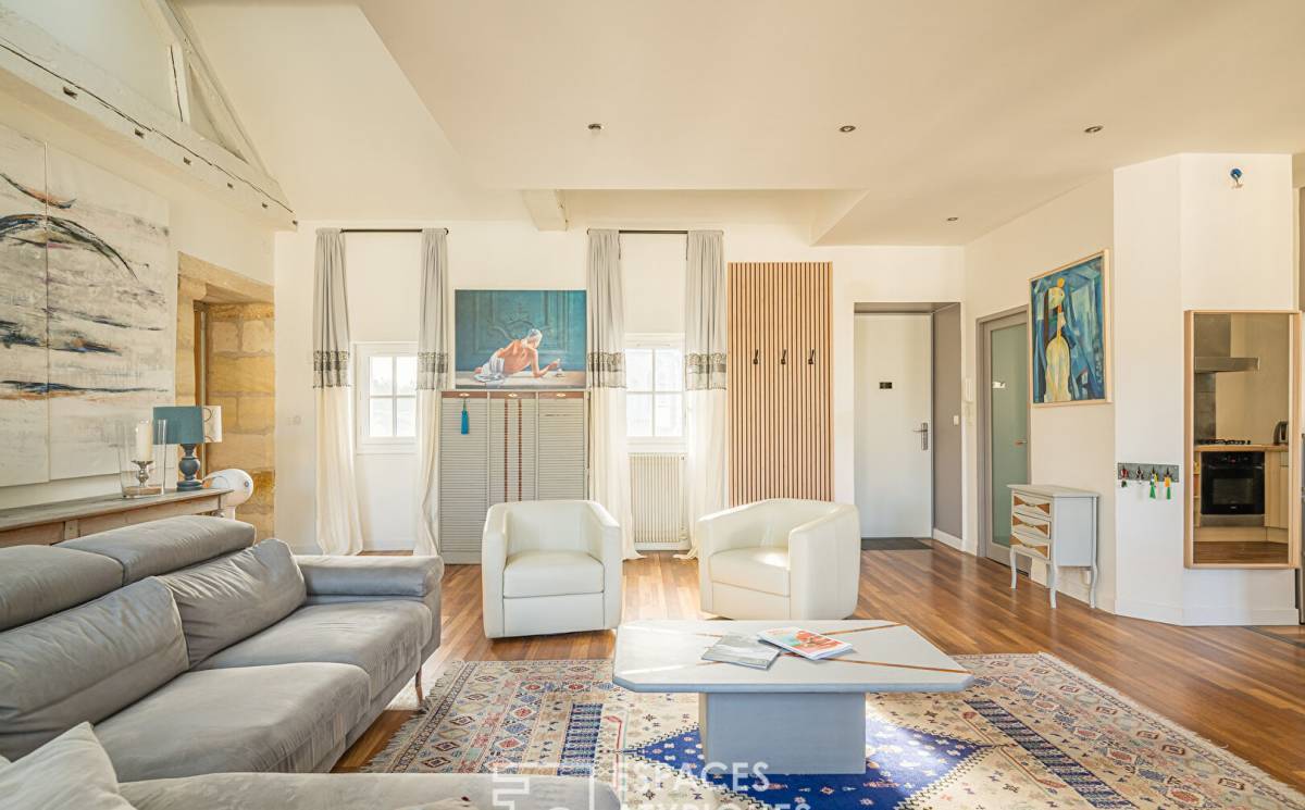 The entrance opens into a spacious living room with a very high ceiling, revealing beautiful original beams. The dual aspect provides magnificent unobstructed views of the quays as well as a lovely, verdant interior garden within the building. An open-plan, fully equipped kitchen completes this room. The two bedrooms are located on either side of the apartment. The first bedroom offers generous proportions and a mezzanine converted into a relaxation area, which could also serve as an office. The second bedroom, located upstairs, is a converted attic space and is charming thanks to its lovely white beams.