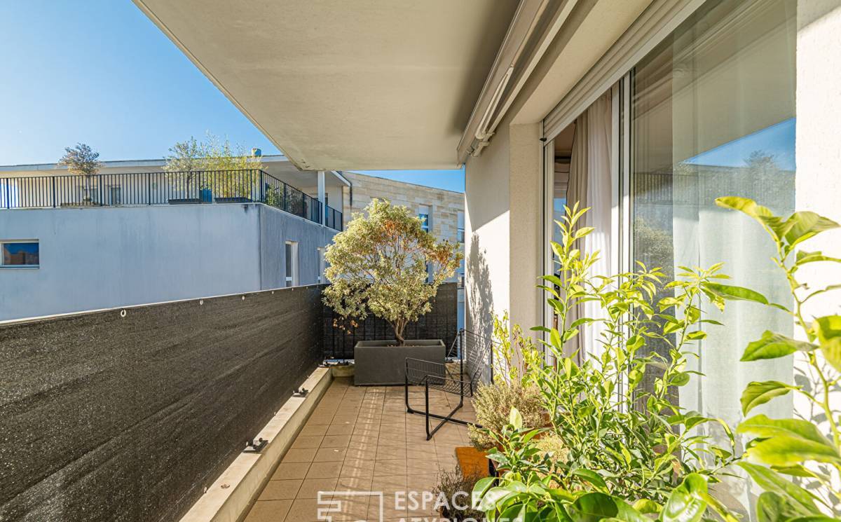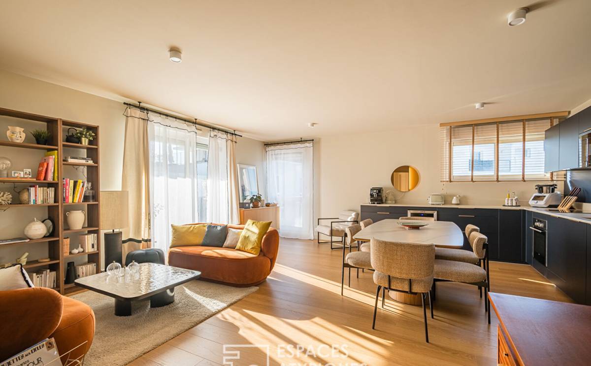 The entrance opens onto a light-filled living room, where quality materials and tasteful decor create a tranquil and welcoming atmosphere. The functional and fully equipped kitchen blends seamlessly into the living space. French doors lead to a first 10 sq m terrace, facing east. From the living room, a hallway leads to two bedrooms, one with a dressing room and the other with built-in closets, sharing a pleasant bathroom. A second hallway leads to a third bedroom with storage, as well as a spacious bathroom. Finally, a fourth bedroom, which could also serve as an office, provides access to a superb 42 sq m terrace, a true outdoor living space ideal for entertaining. Two parking spaces in the residence's secure car park and a large storage room complete this apartment with its rare features.