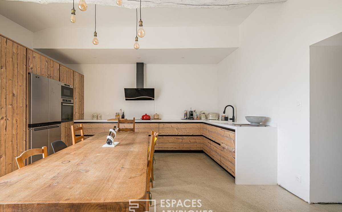 It offers an entrance hall, a separate fitted and equipped kitchen, a living/dining room with very high ceilings, a fireplace with a wood-burning stove, and a laundry room. The upper floor offers an office with a breathtaking view of the living room, two bedrooms and a bathroom, and a master suite with a private shower room.