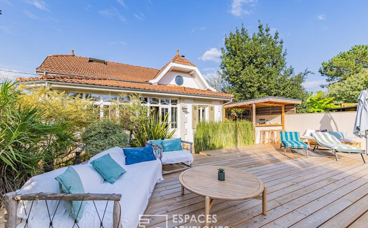 In La Teste-de-Buch, just steps from the port, town center, and the Bassin beaches, this carefully renovated Arcachon house offers approximately 126 sqm of living space on a private, wooded 640 sqm plot. It features a large new wooden terrace, a swimming pool with a Rolling Deck cover, a separate outbuilding, and private parking.