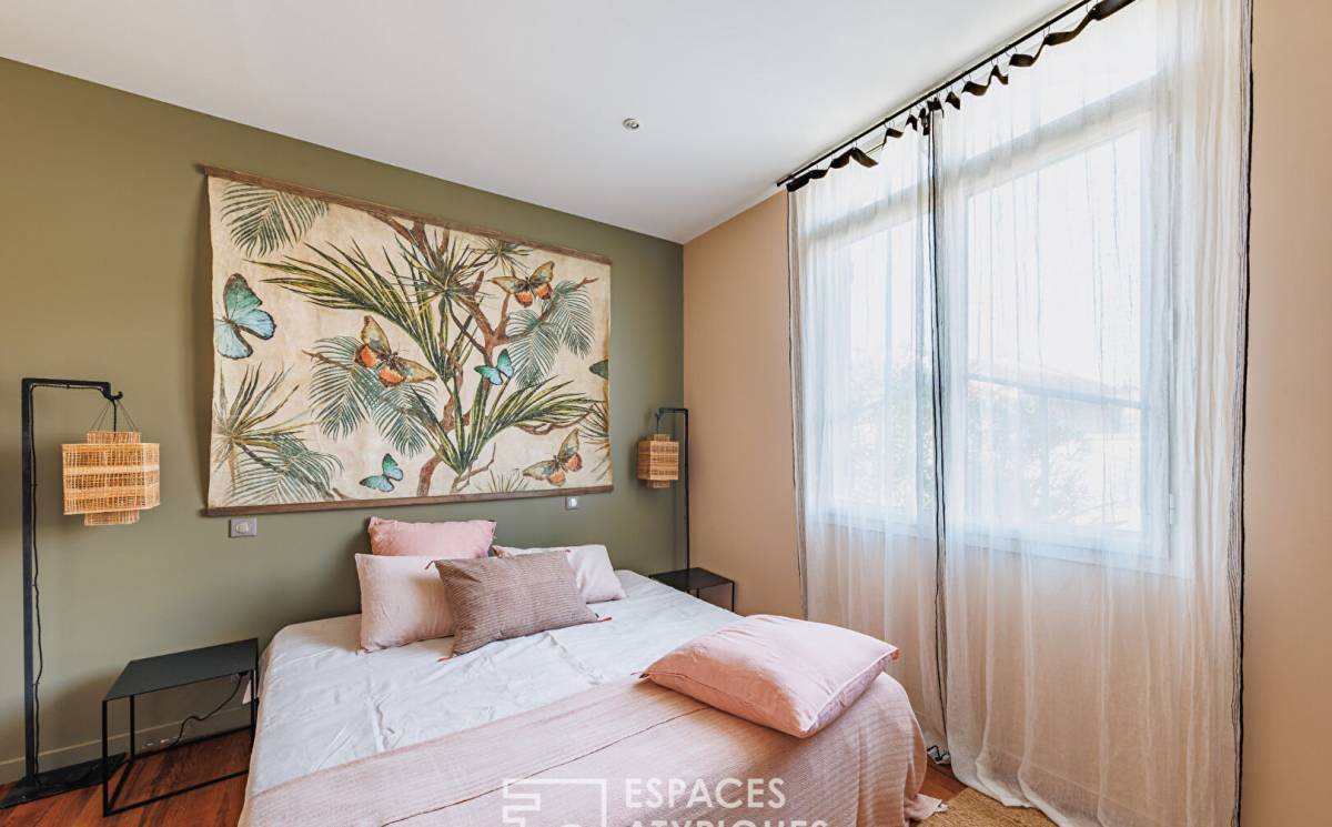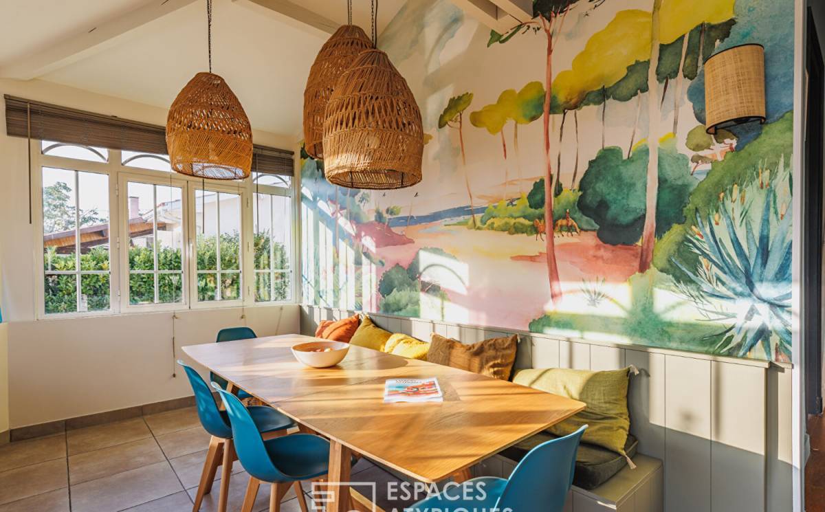 The house includes three bedrooms, two of which are on the ground floor, two bathrooms, and an office. The materials and colors chosen give the whole a colorful, chic and personality-filled atmosphere.