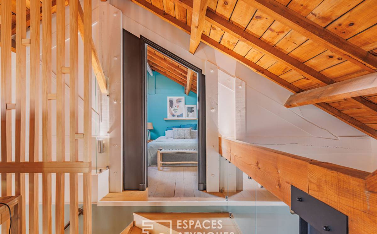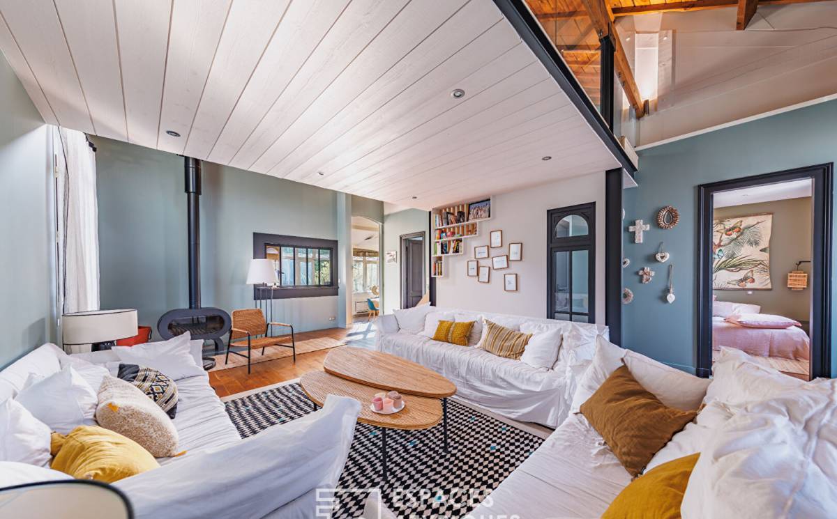 Upon entering, the living room impresses with its spaciousness, exposed timbers, and light. The living room opens onto a modern kitchen and a dining room bathed in light, decorated with a mural and refined natural elements. The space is enhanced by generous ceiling heights and a central wood-burning stove.