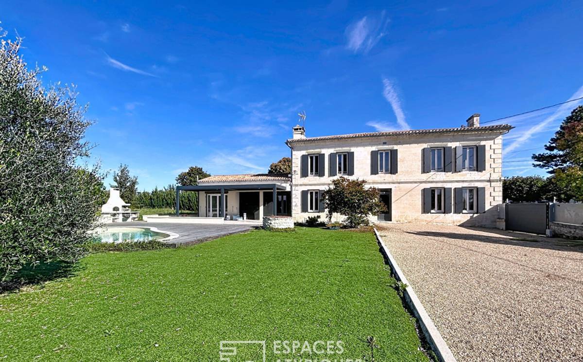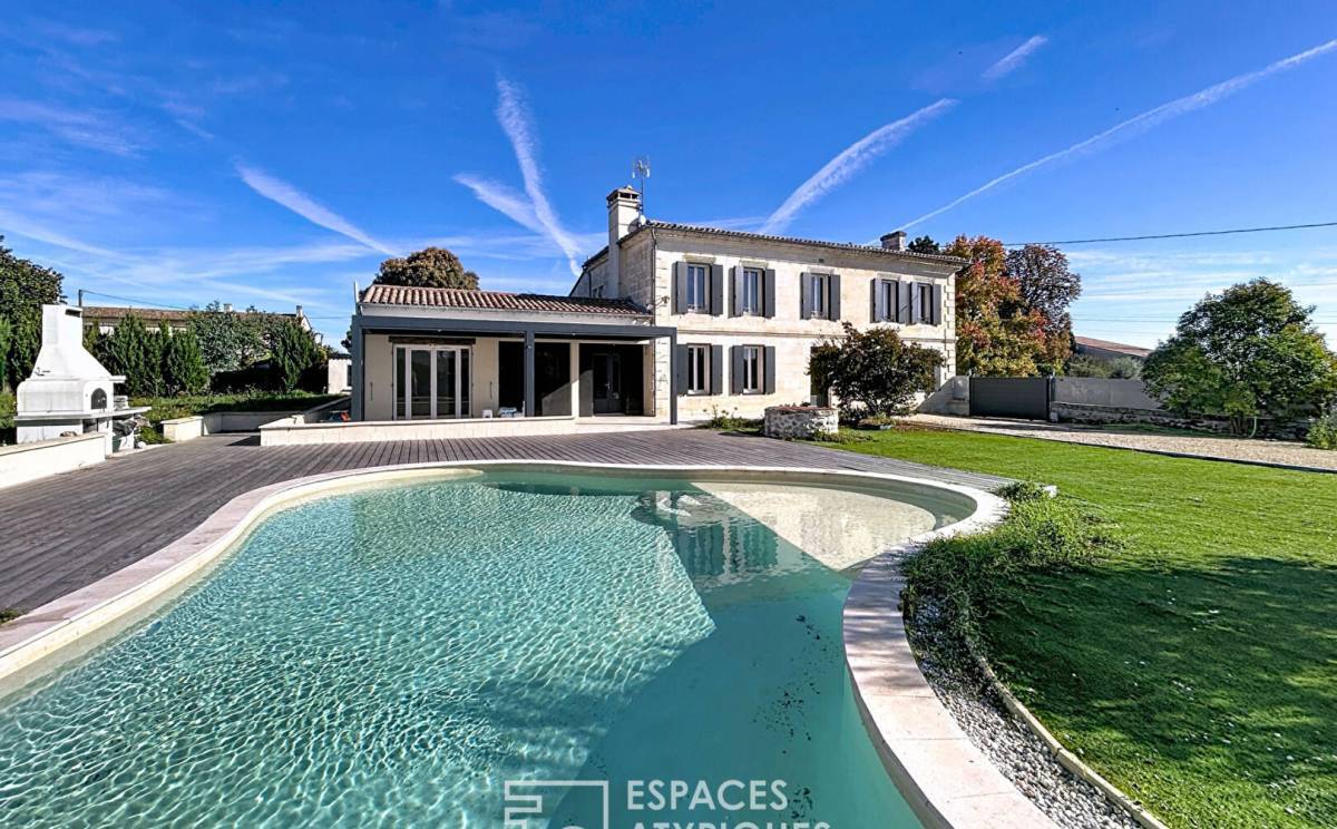On the heights of Fronsac, this elegant stone house of approximately 340 sqm is set in a calm and green environment. Completely renovated, it perfectly combines old-world charm and contemporary comfort. Built on a landscaped plot of over 3200 sqm, it offers spacious spaces, high-quality fittings and a superb heated lagoon pool, a promise of relaxation and conviviality.