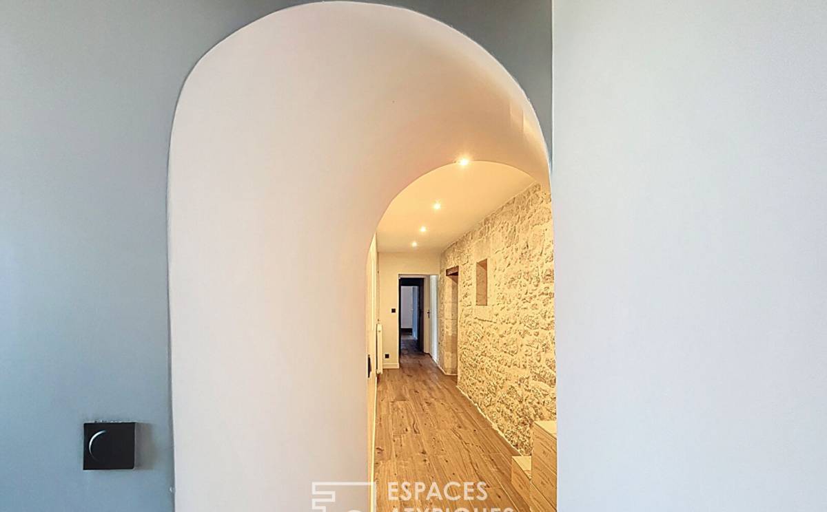Behind its light stone facade with anthracite shutters, the interior seduces with its bright and refined ambiance. The living spaces, open and fluid, retain the original character: beautiful high ceilings, moldings, old fireplaces and parquet floors. The living room opens onto a large covered terrace, ideal for summer meals. The contemporary, perfectly equipped kitchen blends elegantly into this ensemble.