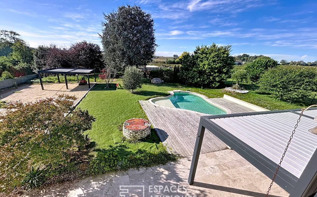 Outside, the enclosed, tree-lined garden is a true haven of peace. The lagoon pool, equipped with a heat pump, blends harmoniously into the landscape and invites relaxation. A wooden terrace borders the swimming area, naturally extending the living spaces to the outdoors.