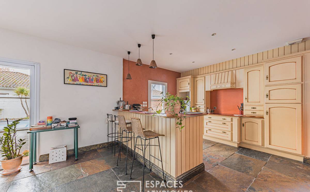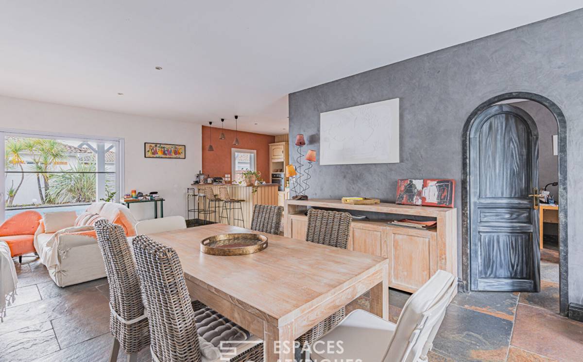 From the moment you enter, natural light floods the spaces, revealing generous volumes designed for well-being and conviviality. The vast, sun-drenched living room opens onto a fitted and equipped kitchen, perfect for sharing moments in a warm and refined atmosphere. Adjoining this is a utility room that combines comfort and practicality.