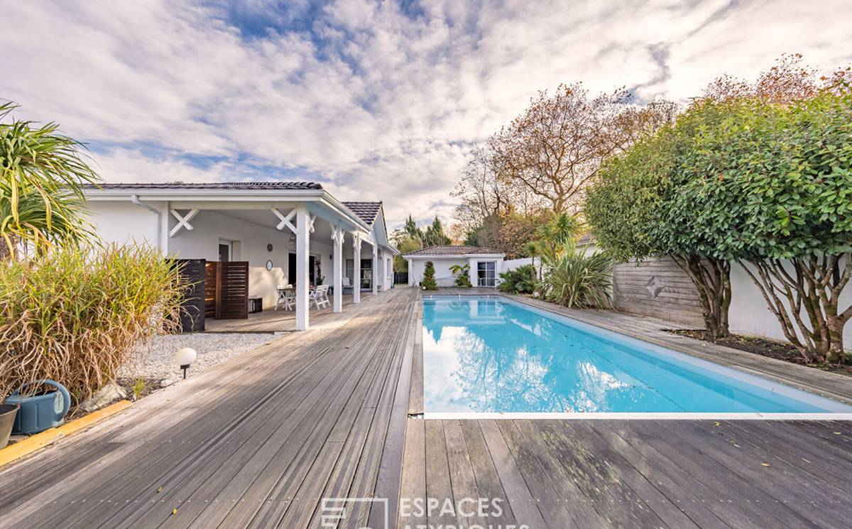 Outside, the magic unfolds. The landscaped outdoor areas draw the eye to an elegant swimming pool, a true invitation to relaxation, and a private, enclosed garden of 825 sqm where calm and privacy reign. This verdant haven allows you to fully enjoy the gentle lifestyle of the Arcachon Basin. A driveway and a spacious garage complete the property, offering the possibility of creating an independent studio, ideal for accommodating guests, working remotely, or considering a rental investment.