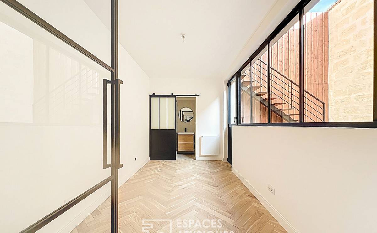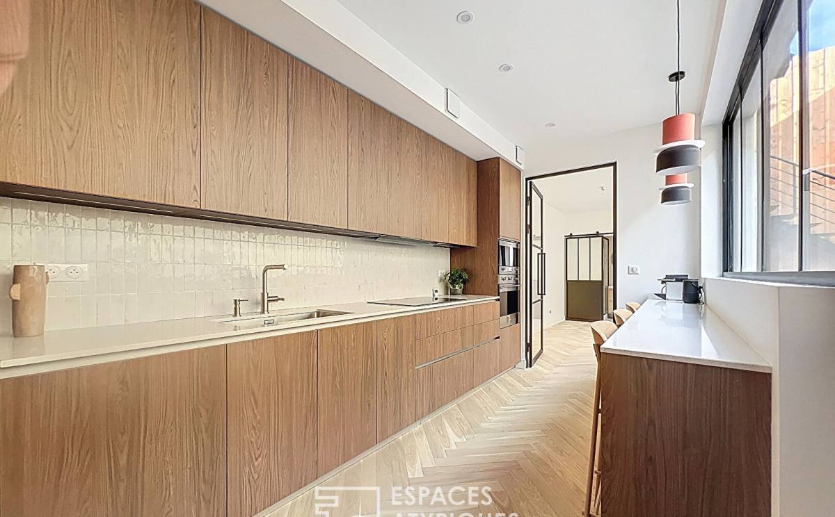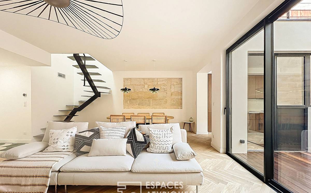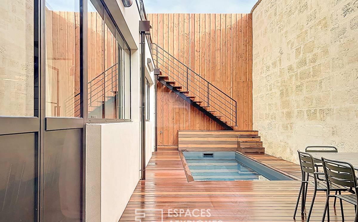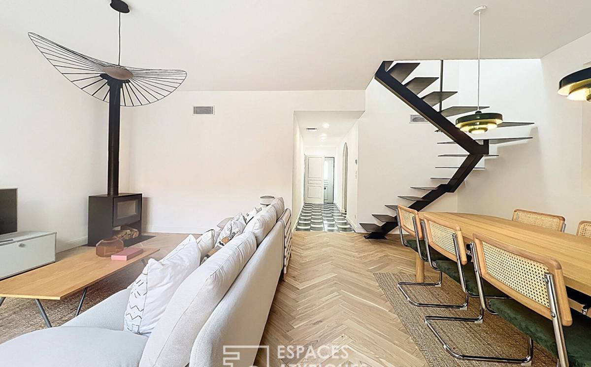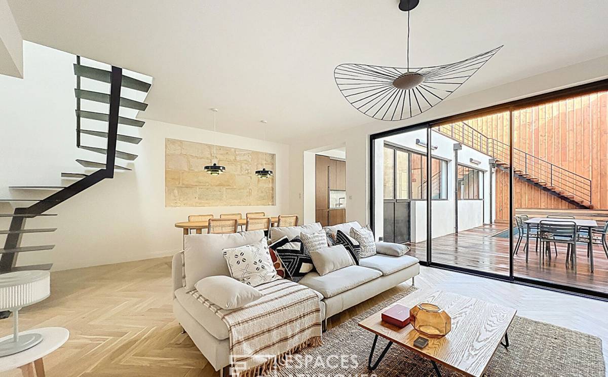In Bouscat, in the immediate vicinity of the Assomption Sainte-Clotilde school complex, this renovated house of approximately 160 sqm, complemented by an 18 sqm garage, stands out for its contemporary architecture and heritage charm. Arranged around a private 90 sqm outdoor space with a swimming pool, it offers a harmonious living environment blending modern comfort with period character.