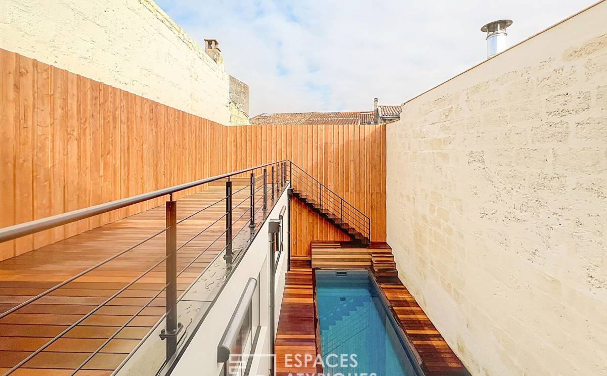 The exterior extends the warm ambiance of the interior. The exotic wood deck features an elegant swimming pool, designed to provide a discreet and private space. The upstairs terrace, accessible from the master suite, offers a privileged view of this intimate haven. The immediate surroundings benefit from a sought-after location, close to schools, shops, and public transport, in the heart of a desirable residential area of Le Bouscat.