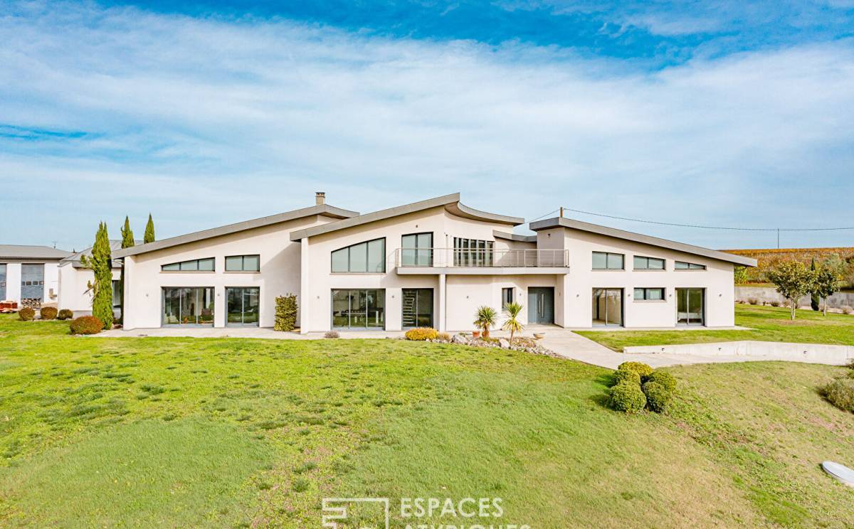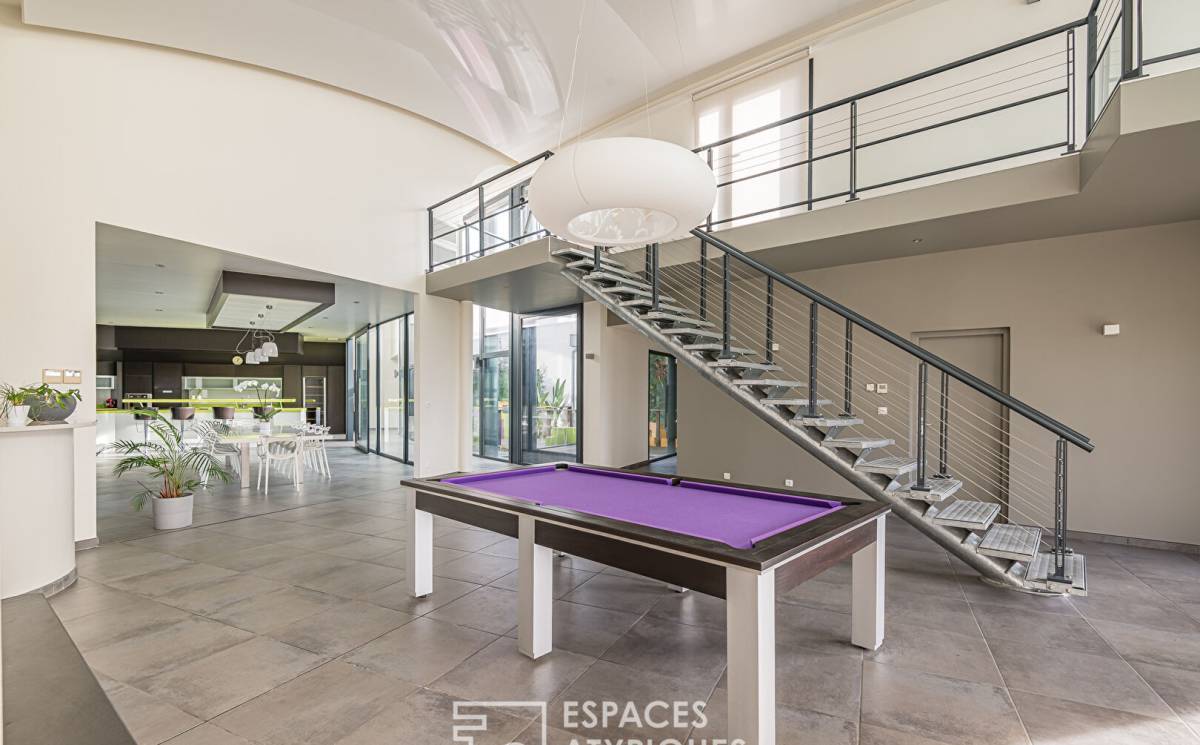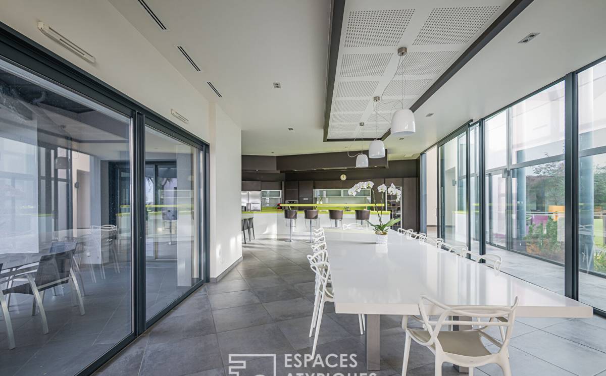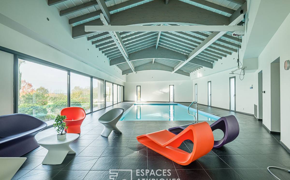 Set on nearly 3 hectares of land, just 2 km from the center of Sainte-Bazeille and 5 km from Marmande, about an hour from Bordeaux, this ultra-contemporary property offers 487 sqm of living space amidst an open horizon. Nestled in a peaceful and secluded setting, it benefits from over 1,295 sqm of outbuildings, including 217 sqm of covered outdoor spaces, offering exceptional versatility. With its bold architecture, airy volumes, and energy efficiency, modernity is experienced on a grand scale. Conceived as a fluid structure, the house is organized around a light-filled central atrium, the true backbone of the interior circulation.