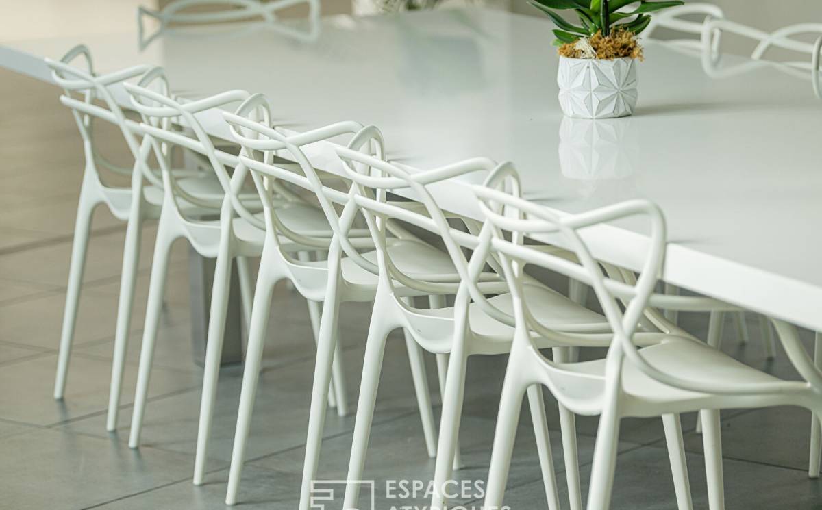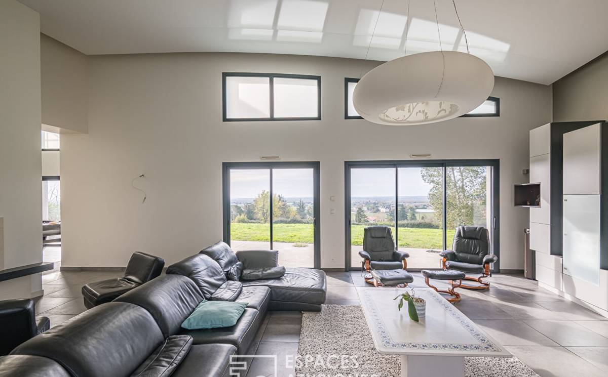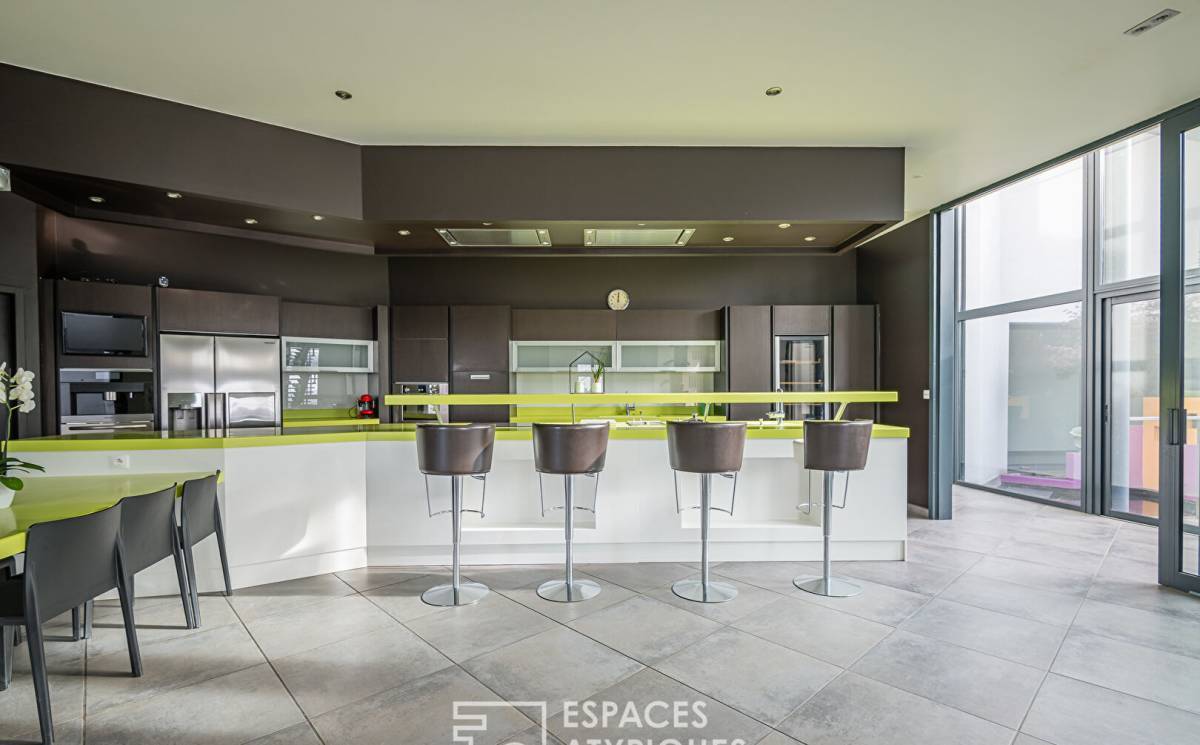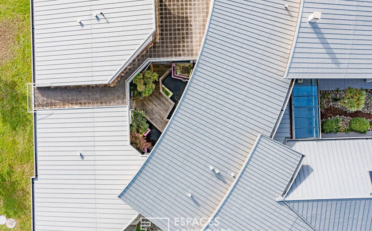 Set on nearly 3 hectares of land, just 2 km from the center of Sainte-Bazeille and 5 km from Marmande, about an hour from Bordeaux, this ultra-contemporary property offers 487 sqm of living space amidst an open horizon. Nestled in a peaceful and secluded setting, it benefits from over 1,295 sqm of outbuildings, including 217 sqm of covered outdoor spaces, offering exceptional versatility. With its bold architecture, airy volumes, and energy efficiency, modernity is experienced on a grand scale. Conceived as a fluid structure, the house is organized around a light-filled central atrium, the true backbone of the interior circulation.