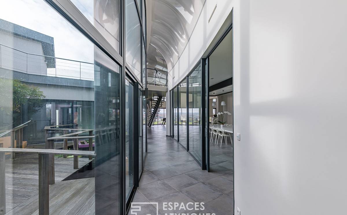 Upstairs, a panoramic solarium extends like a suspended belvedere, offering unobstructed views of the surrounding countryside and extending the house's decidedly contemplative spirit.