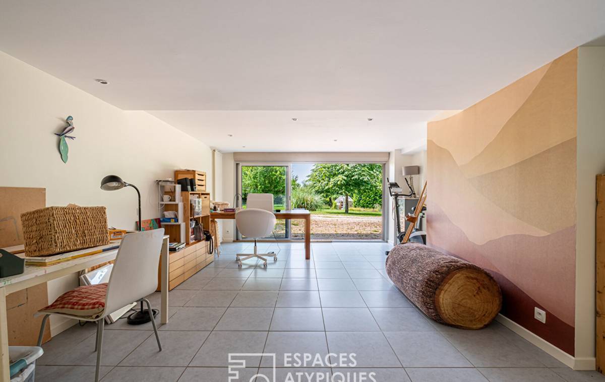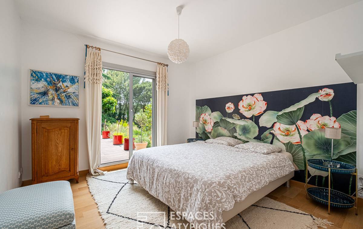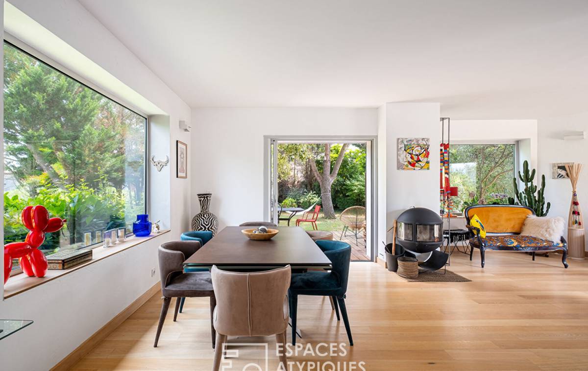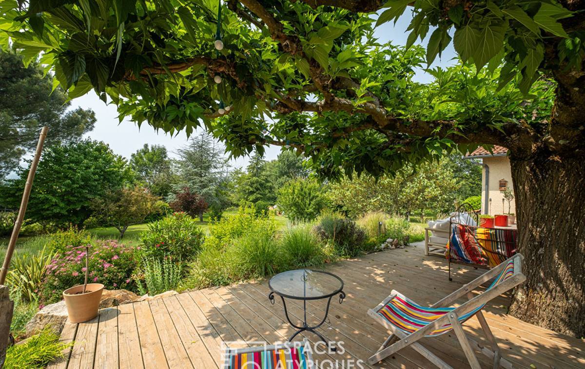 Located in Brindas, on the edge of Francheville, this architect-designed house of over 200 sqm is set in a preserved and confidential environment, on a wooded plot of 6,500 sqm to be admired from every room of the house. Entirely renovated with quality materials, it combines character, brightness and serenity in a resolutely contemporary spirit, in the heart of the countryside. The entrance leads on one level to a vast living room composed of a cozy living room, a dining room and a kitchen perfectly integrated into the whole. The sliding doors allow access to the garden from the entire space. Three bedrooms are spread over this level, accompanied by a bathroom with a walk-in shower and bathtub. Upstairs, a master suite opens onto a light-filled office with views of the surrounding nature, offering an intimate and soothing space. The lower level has a bedroom designed as a studio with a separate entrance, ideal according to the needs of each individual. A laundry room, a cellar and a large annex room complete this level which could accommodate a games room, a creative space or a music room. The exteriors have been carefully designed to offer different atmospheres: swimming pool, pétanque court, shaded terraces, flower beds which are arranged around large trees and omnipresent nature. A shed located in the garden allows the parking of a vehicle or the storage of equipment. The calm, the conviviality and the openings onto the landscape make this house a rare proposition. DPE in progress