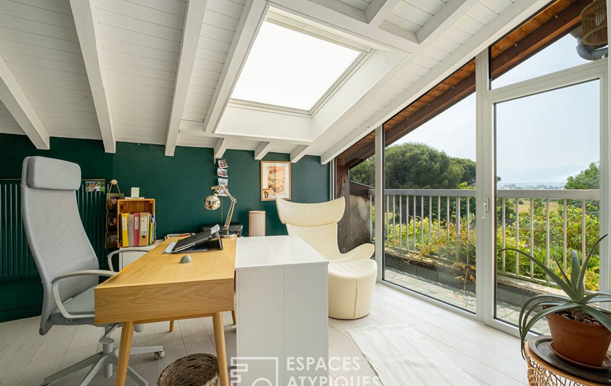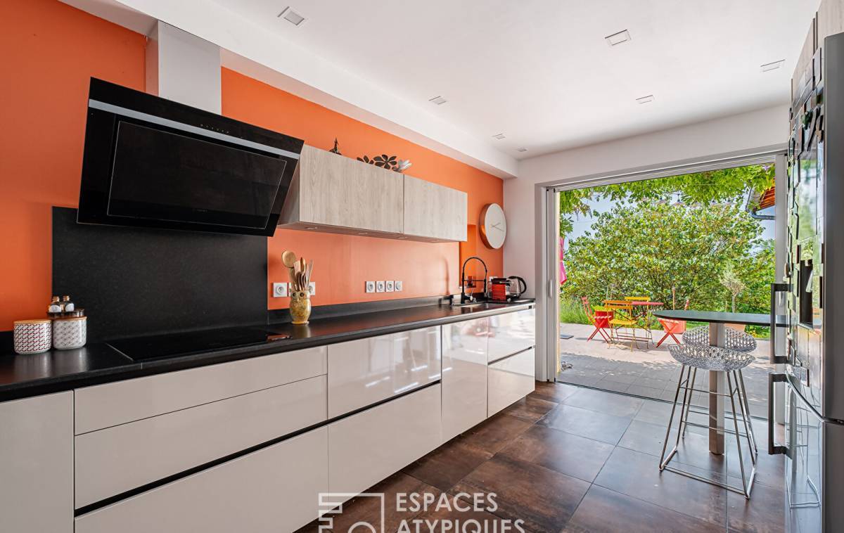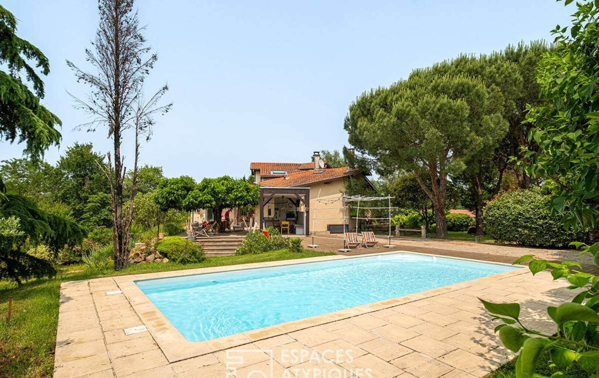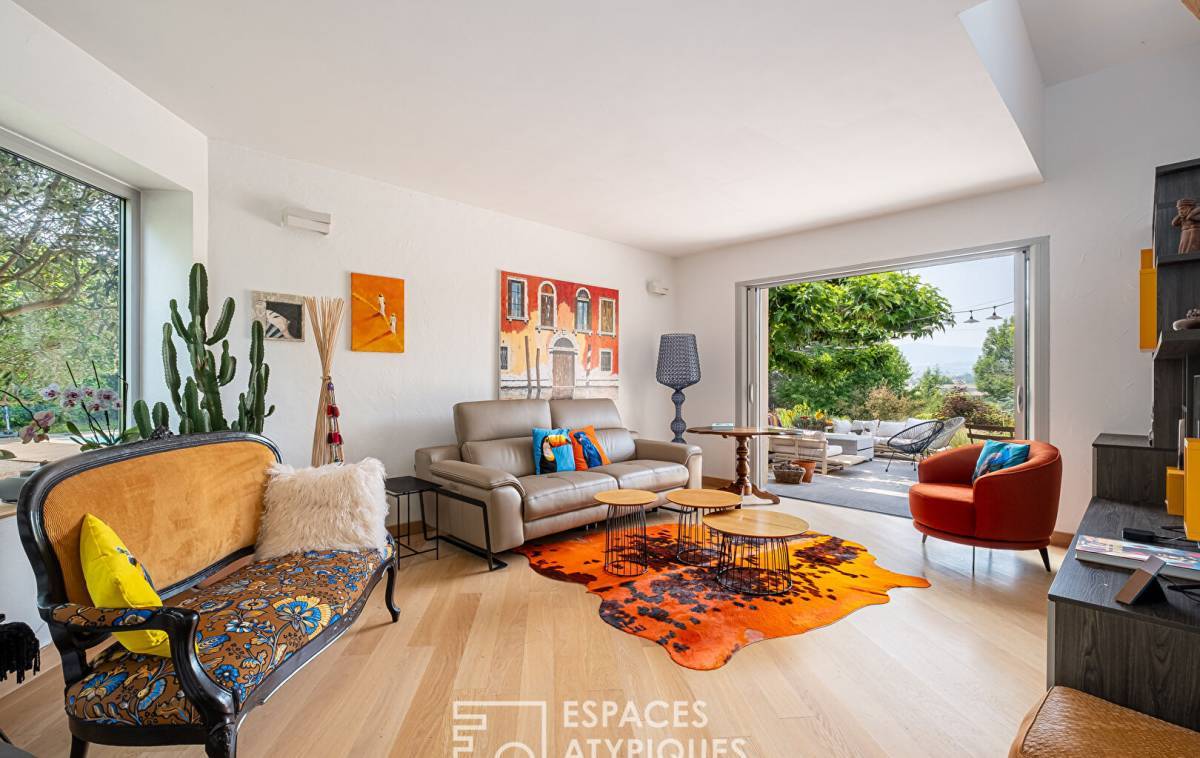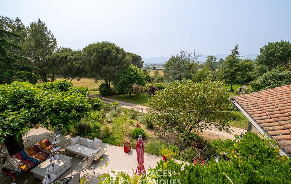 Located in Brindas, on the edge of Francheville, this architect-designed house of over 200 sqm is set in a preserved and confidential environment, on a wooded plot of 6,500 sqm to be admired from every room of the house. Entirely renovated with quality materials, it combines character, brightness and serenity in a resolutely contemporary spirit, in the heart of the countryside. The entrance leads on one level to a vast living room composed of a cozy living room, a dining room and a kitchen perfectly integrated into the whole. The sliding doors allow access to the garden from the entire space. Three bedrooms are spread over this level, accompanied by a bathroom with a walk-in shower and bathtub. Upstairs, a master suite opens onto a light-filled office with views of the surrounding nature, offering an intimate and soothing space. The lower level has a bedroom designed as a studio with a separate entrance, ideal according to the needs of each individual. A laundry room, a cellar and a large annex room complete this level which could accommodate a games room, a creative space or a music room. The exteriors have been carefully designed to offer different atmospheres: swimming pool, pétanque court, shaded terraces, flower beds which are arranged around large trees and omnipresent nature. A shed located in the garden allows the parking of a vehicle or the storage of equipment. The calm, the conviviality and the openings onto the landscape make this house a rare proposition. DPE in progress