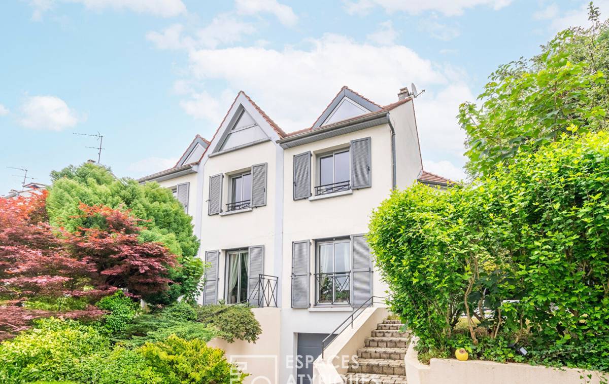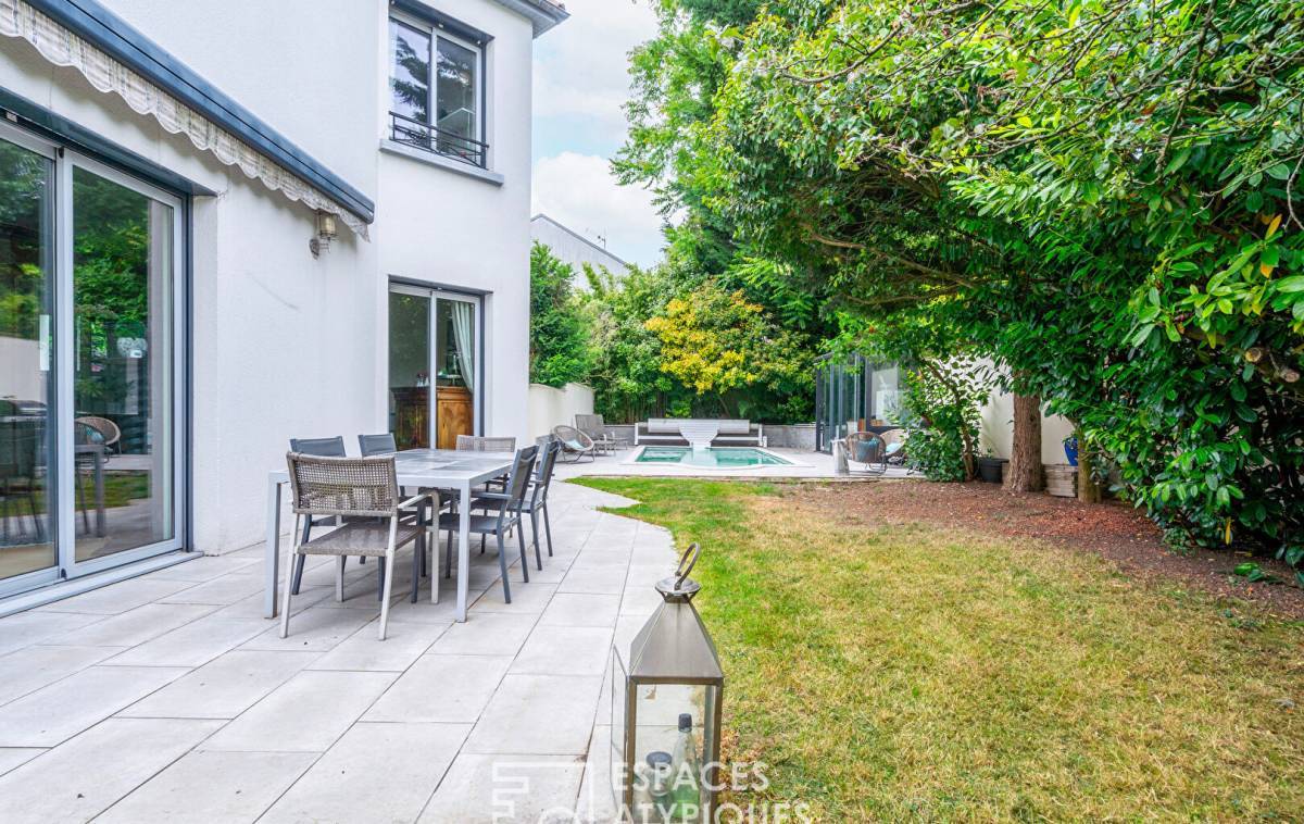 Just a few minutes' walk from the heart of Bry-sur-Marne and the RER A, this elegant, contemporary 180 sqm property sits set back on a 498 sqm plot, nestled in lush greenery, protected from the hustle and bustle.