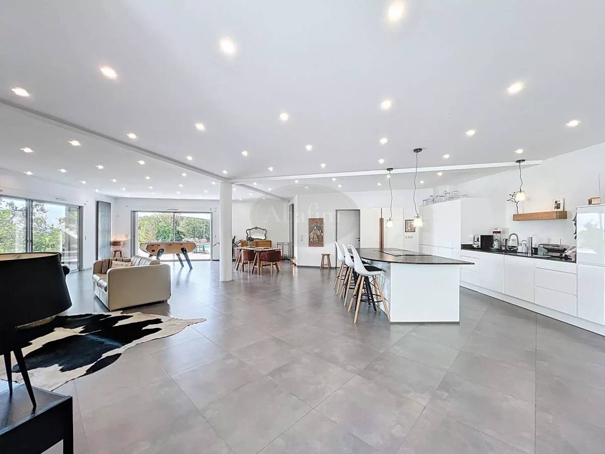 Quietly located 10 minutes from the beach between Cannes and Nice Côte d'Azur, this majestic, contemporary 350m² architect-designed villa features a huge living room, kitchen, utility room, 5 bedrooms, 2 bathrooms, 2 toilets, 1 office, double garage, terrace and swimming pool, all set in 3000m² of enclosed, wooded grounds.