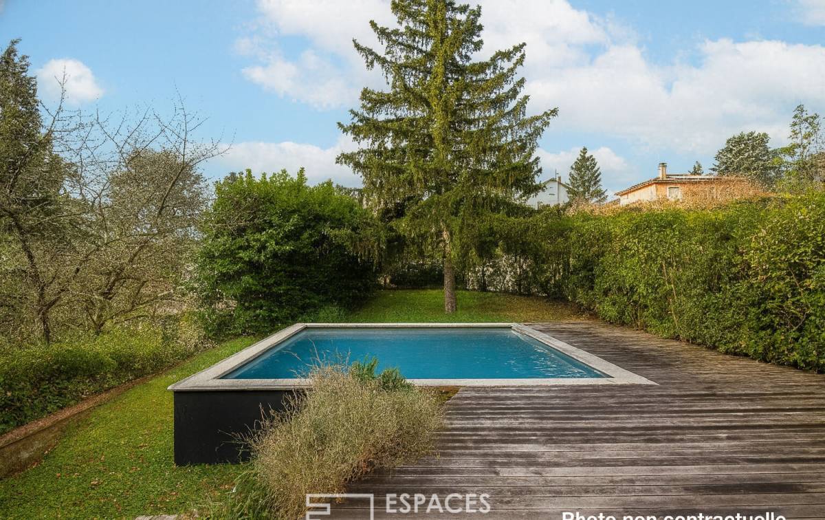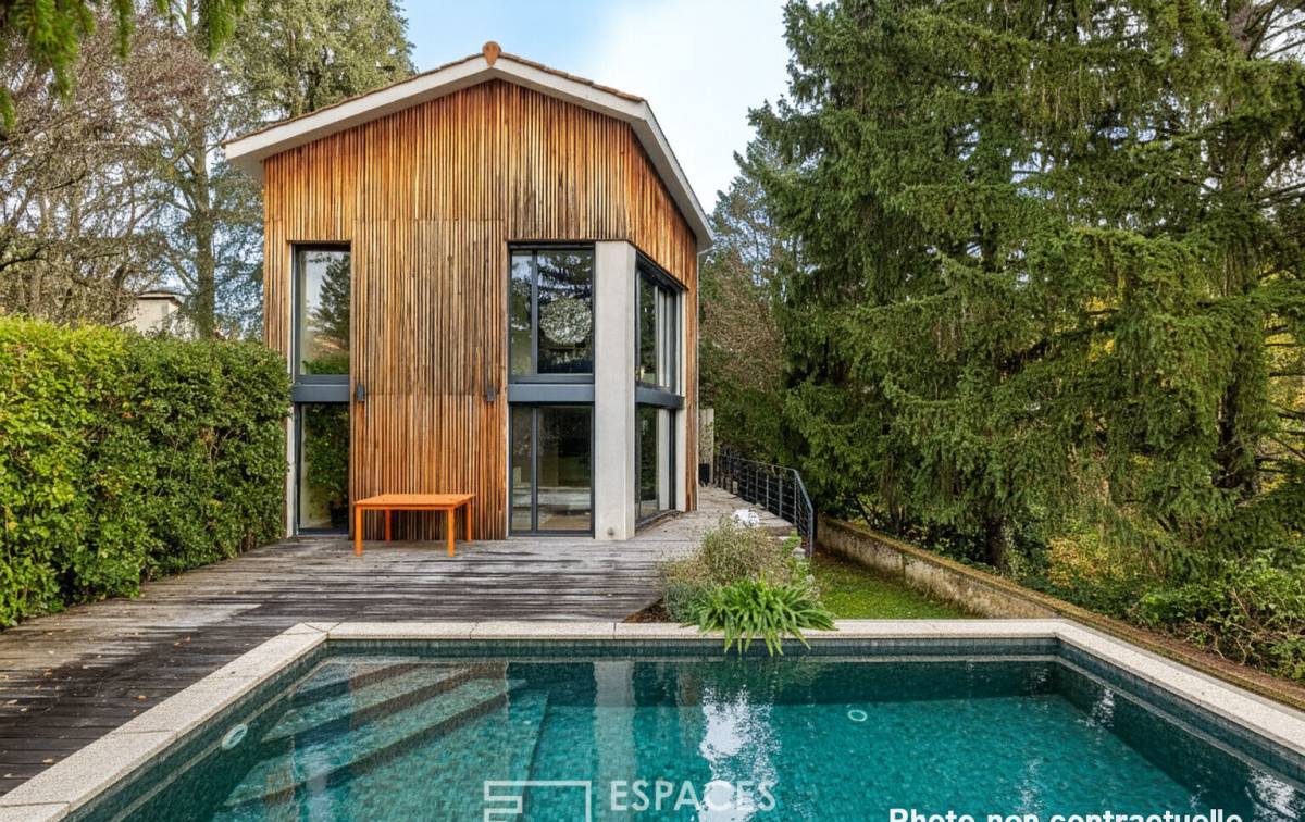 In the hills above Crépieux, bordering Caluire, this contemporary 2013 house offers 215 sq m of living space, a swimming pool, and a double garage, all nestled within a 979 sq m wooded plot. Located at the end of a cul-de-sac, it enjoys a peaceful and secluded setting.