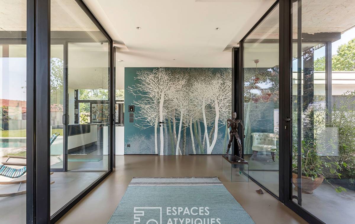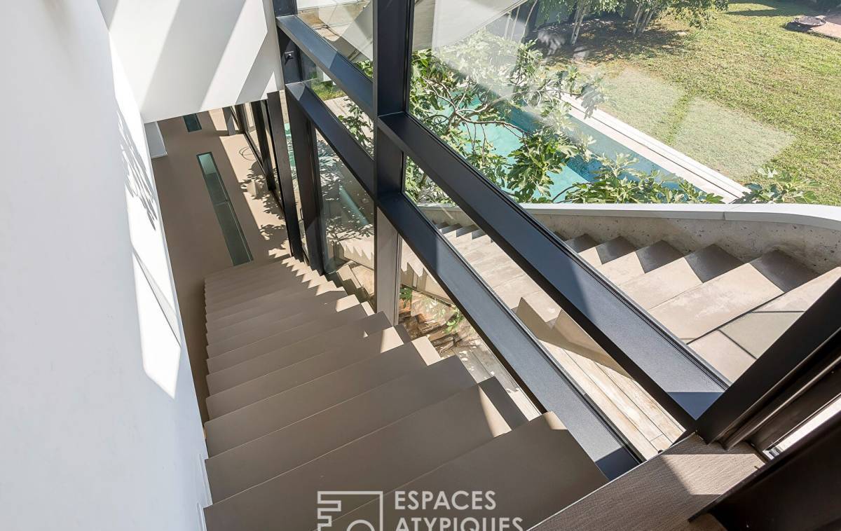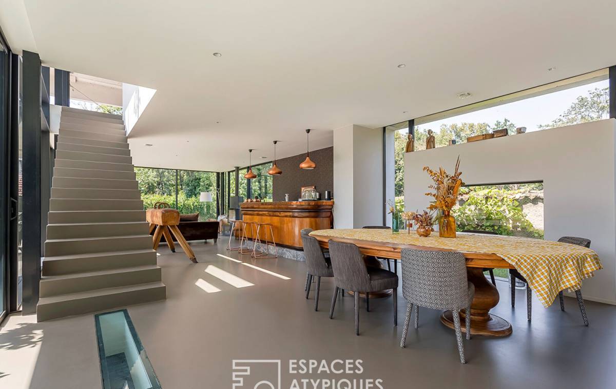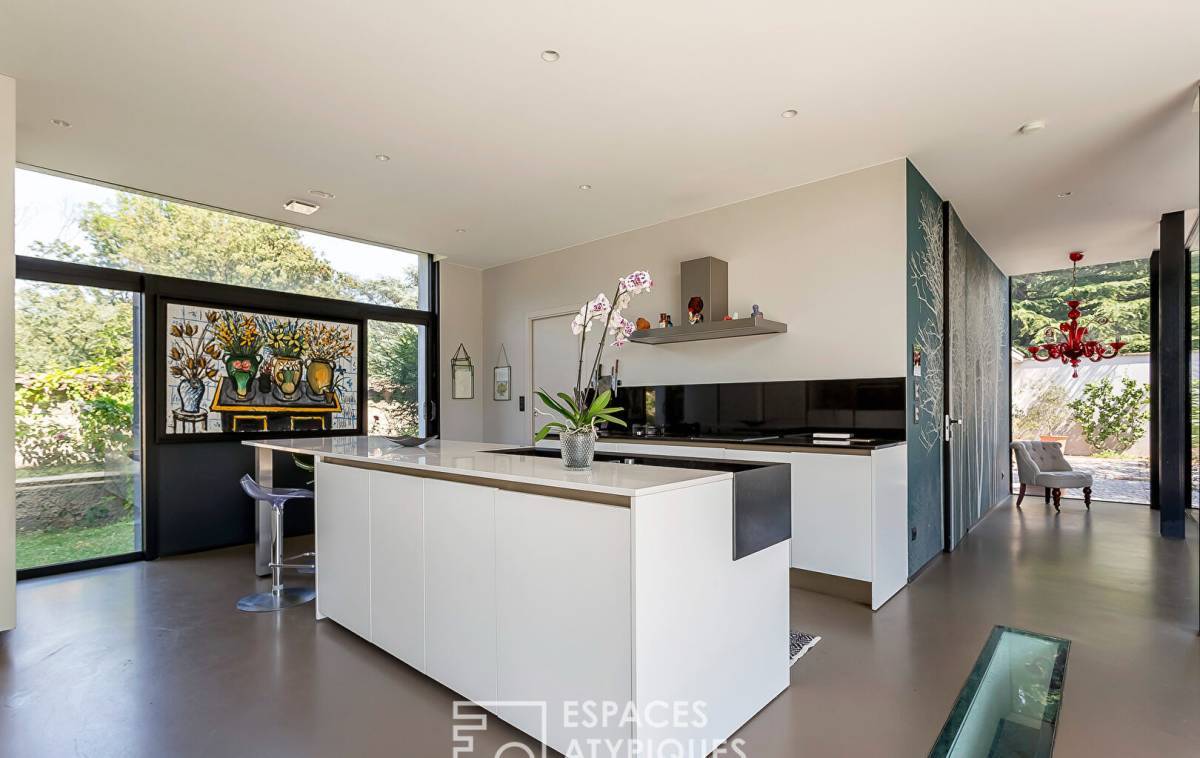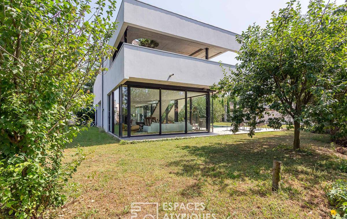 Nestled in Caluire-et-Cuire, in the immediate vicinity of Bourg, this contemporary 280 sqm house, designed by architect Michel Guillot, stands out for its unique design and peaceful setting on a landscaped 1381 sqm plot. With its 6 rooms, including 4 bedrooms, this property offers an exceptional living environment, combining modern comfort and refined aesthetics. Two double garages complete this property, ensuring easy parking. Inside, a contemporary entrance hall invites you to discover bright living spaces. The modern kitchen, decorated with a pantry, opens onto a double living room where a dining room and reception room meet, enhanced by an antique bar. Resin floors add a touch of elegance to this welcoming space. The master suite, offering direct access to the garden and swimming pool, consists of a dressing room and a spacious bathroom with a bathtub and shower. Upstairs, a TV lounge area, two bedrooms sharing a bathroom, and a bedroom with its own bathroom guarantee optimal comfort. Two terraces invite you to enjoy unobstructed views of the surroundings. The exterior is equally attractive, with a mirror pool that blends harmoniously into the landscaped garden. This flat plot is ideal for moments of relaxation or family conviviality: green spaces, shaded terraces, and a pétanque court. The house also benefits from a 50 sqm cellar and its wine cellar, offering additional storage options or a games room or cinema room. This atypical property, with its modern architecture and high-end amenities, represents a rare opportunity on the real estate market. Far from classic standards, this property stands out for its warm atmosphere and carefully designed spaces. High-end amenities. Two double garages. Plenty of parking. 50 sqm cellar with wine cellar. Heated swimming pool. ENERGY CLASS: C / CLIMATE CLASS: C Estimated average amount of annual energy expenditure for standard use, indexed to the years 2021, 2022, 2023: between EUR3,160 and EUR4,330 (subscription included)
