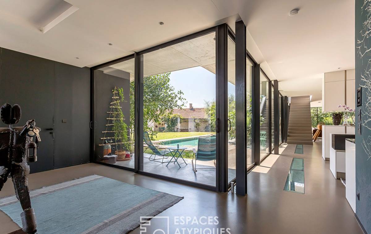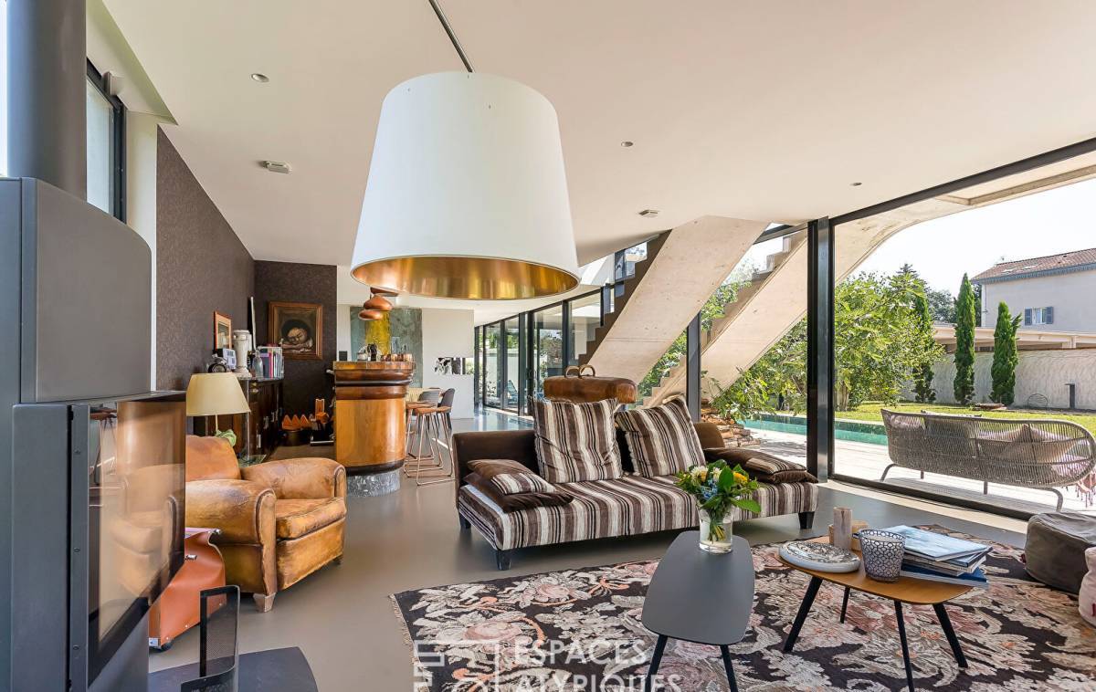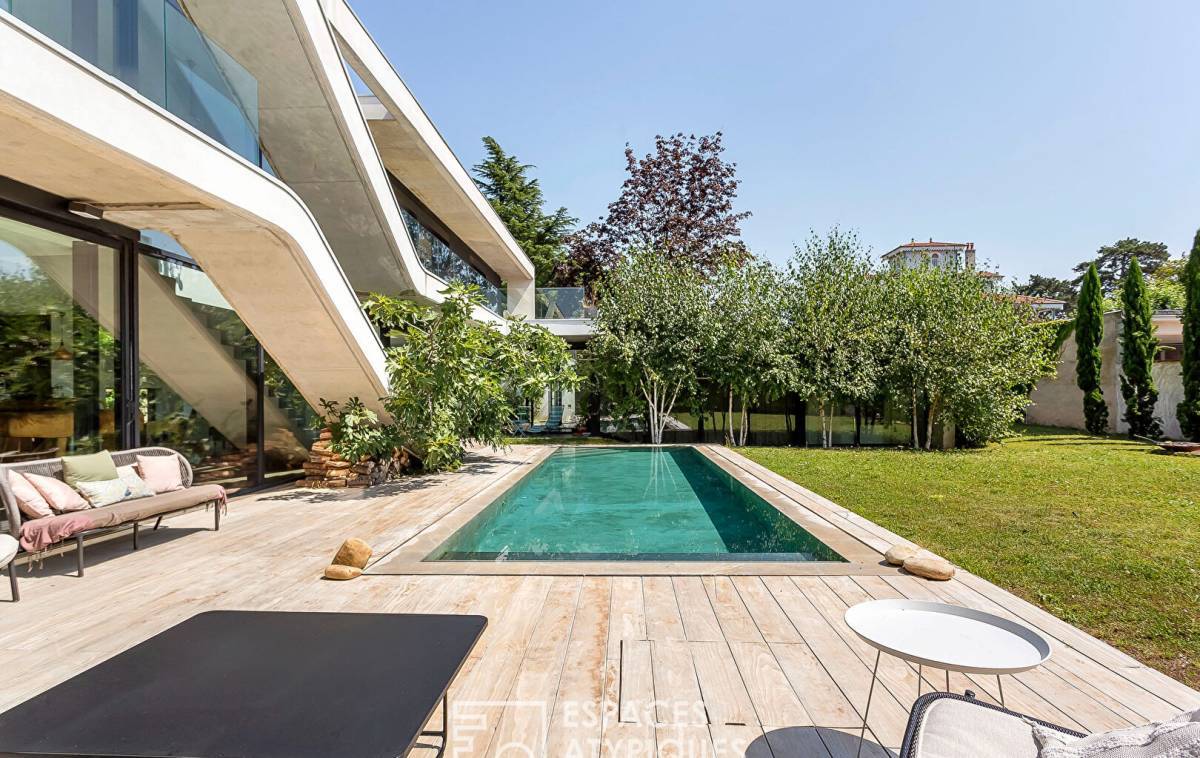 Nestled in Caluire-et-Cuire, in the immediate vicinity of Bourg, this contemporary 280 sqm house, designed by architect Michel Guillot, stands out for its unique design and peaceful setting on a landscaped 1381 sqm plot. With its 6 rooms, including 4 bedrooms, this property offers an exceptional living environment, combining modern comfort and refined aesthetics. Two double garages complete this property, ensuring easy parking. Inside, a contemporary entrance hall invites you to discover bright living spaces. The modern kitchen, decorated with a pantry, opens onto a double living room where a dining room and reception room meet, enhanced by an antique bar. Resin floors add a touch of elegance to this welcoming space. The master suite, offering direct access to the garden and swimming pool, consists of a dressing room and a spacious bathroom with a bathtub and shower. Upstairs, a TV lounge area, two bedrooms sharing a bathroom, and a bedroom with its own bathroom guarantee optimal comfort. Two terraces invite you to enjoy unobstructed views of the surroundings. The exterior is equally attractive, with a mirror pool that blends harmoniously into the landscaped garden. This flat plot is ideal for moments of relaxation or family conviviality: green spaces, shaded terraces, and a pétanque court. The house also benefits from a 50 sqm cellar and its wine cellar, offering additional storage options or a games room or cinema room. This atypical property, with its modern architecture and high-end amenities, represents a rare opportunity on the real estate market. Far from classic standards, this property stands out for its warm atmosphere and carefully designed spaces. High-end amenities. Two double garages. Plenty of parking. 50 sqm cellar with wine cellar. Heated swimming pool. ENERGY CLASS: C / CLIMATE CLASS: C Estimated average amount of annual energy expenditure for standard use, indexed to the years 2021, 2022, 2023: between EUR3,160 and EUR4,330 (subscription included)