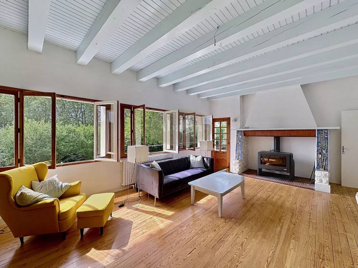 The most interesting things are found on the first floor, which is reached pay an interior staircase or by two exterior staircases. This floor is composed of a big kitchen-cum-dining room (28 m²) with a wood-burning heater and a very bright living room (36 m²) that also has a wood-burning heater. Both rooms give onto a big wooden terrace that faces east and south. This floor also has a bedroom and study (13 m² each), a shower-room and a separate toilet.
