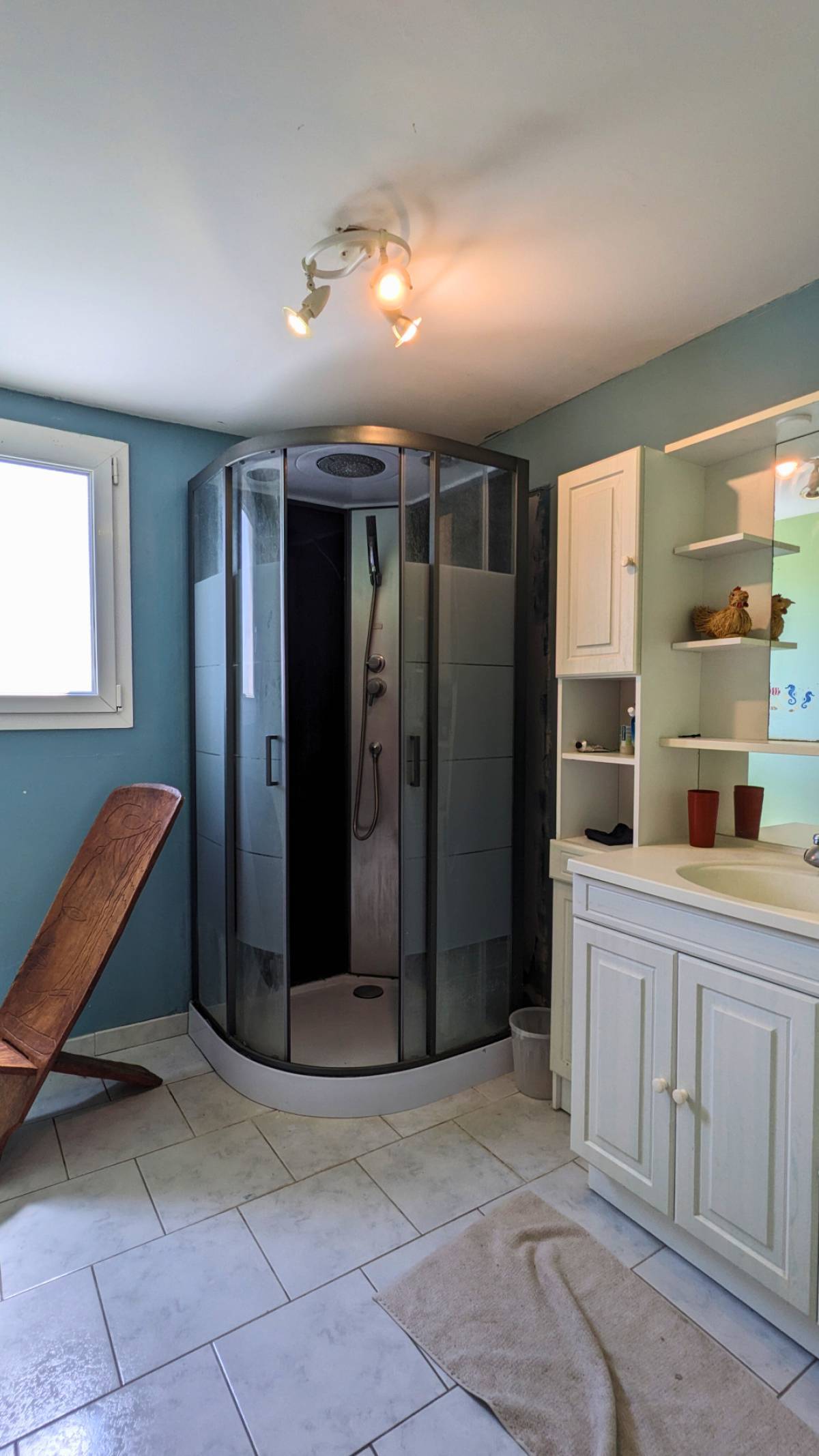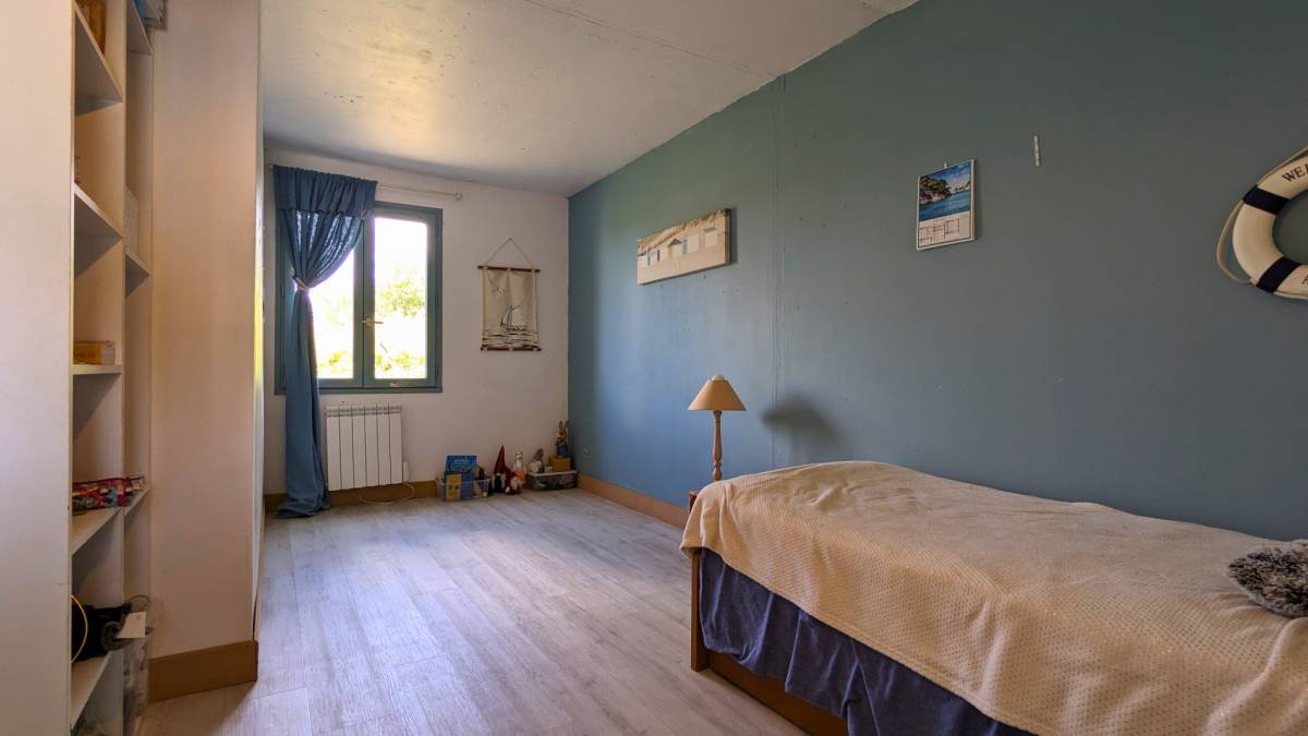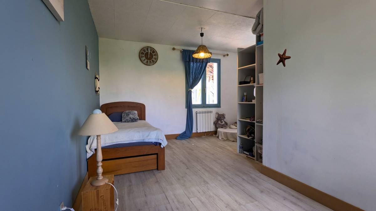 Saint-Georges-de-Didonne (17) - This 1990s building, built on an enclosed plot of 800 m2, offers a very pleasant, quiet setting, not overlooked, and 4 km from the beaches. Its spacious rooms require modernization, but it is still habitable as is. Upon entering, you will be greeted by a large living room bathed in natural light and decorated with a wood-burning stove.