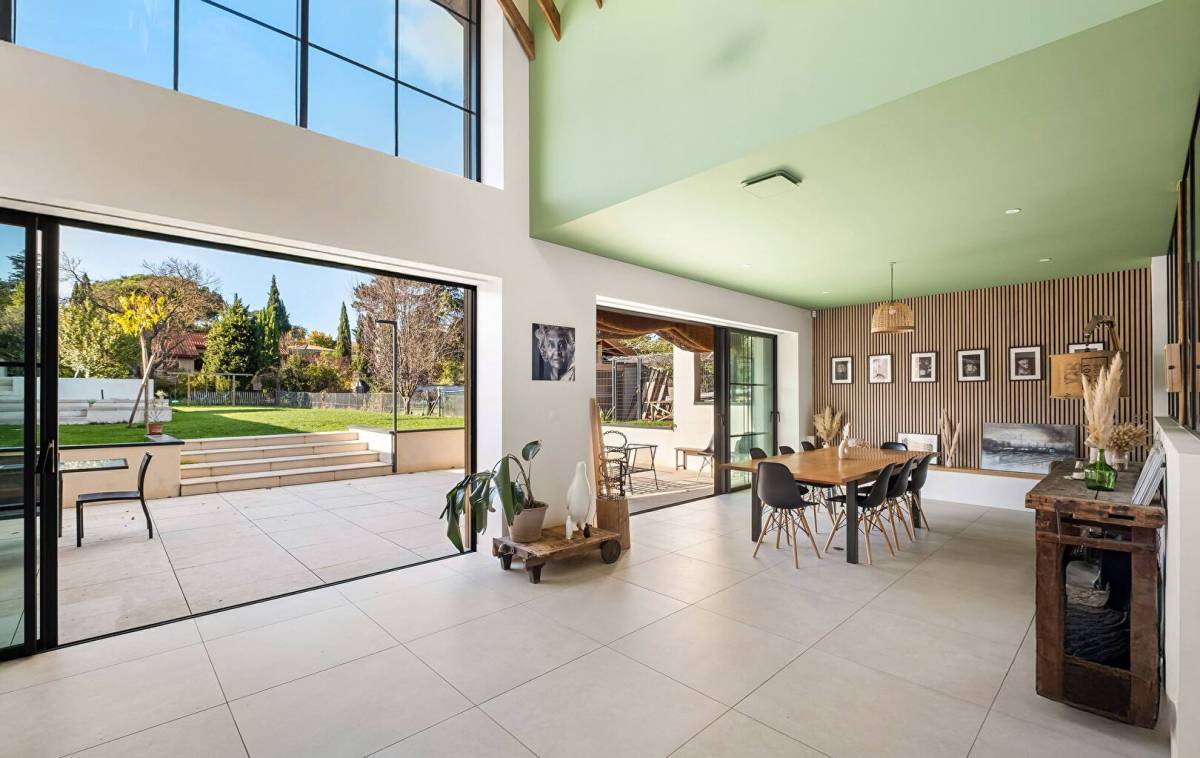 From the moment you enter, the 120-square-meter cathedral-ceilinged living room makes a powerful statement. Clean lines, exposed beams, and noble materials interact in perfect harmony. A custom-made bay window, over ten meters long, floods the space with light and opens the house onto the terrace and garden. The high-end kitchen, at the heart of the room, naturally extends the living room with its fireplace and the dining room, which opens onto the outdoors. At its center, a glass-enclosed wine cellar is revealed like a work of art.