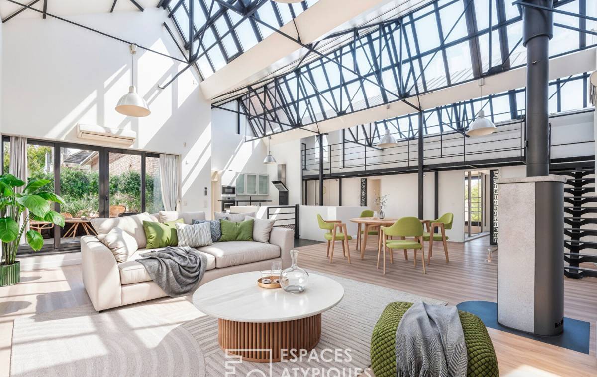 Nestled in the quiet and sought-after Les Gondoles Sud district of Choisy-le-Roi, this former cardboard factory has been converted into a duplex loft spanning 160 sqm with a resolutely contemporary feel. A truly unique living space, it combines industrial architecture, spectacular volumes, and ever-present light from a zenithal opening roof that soars to over 5 meters high.