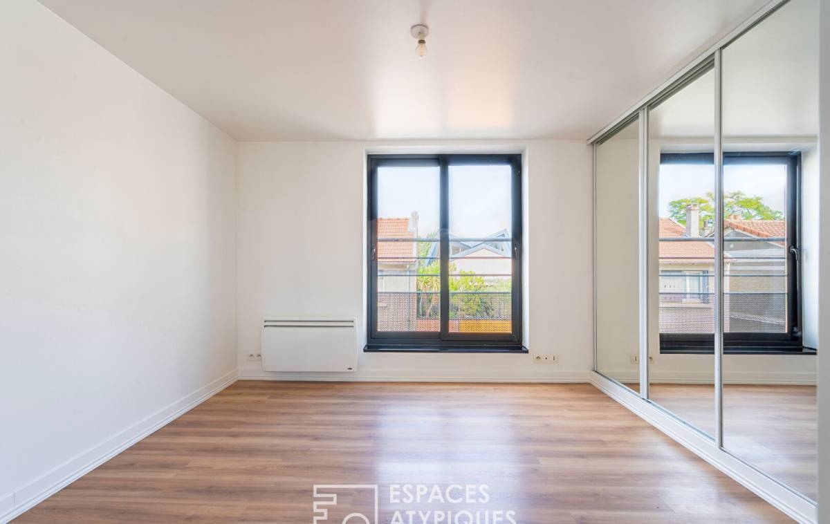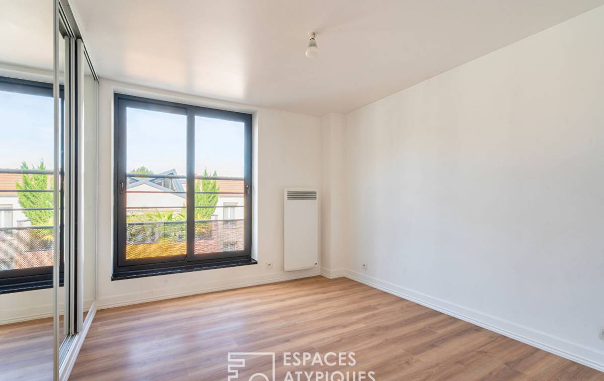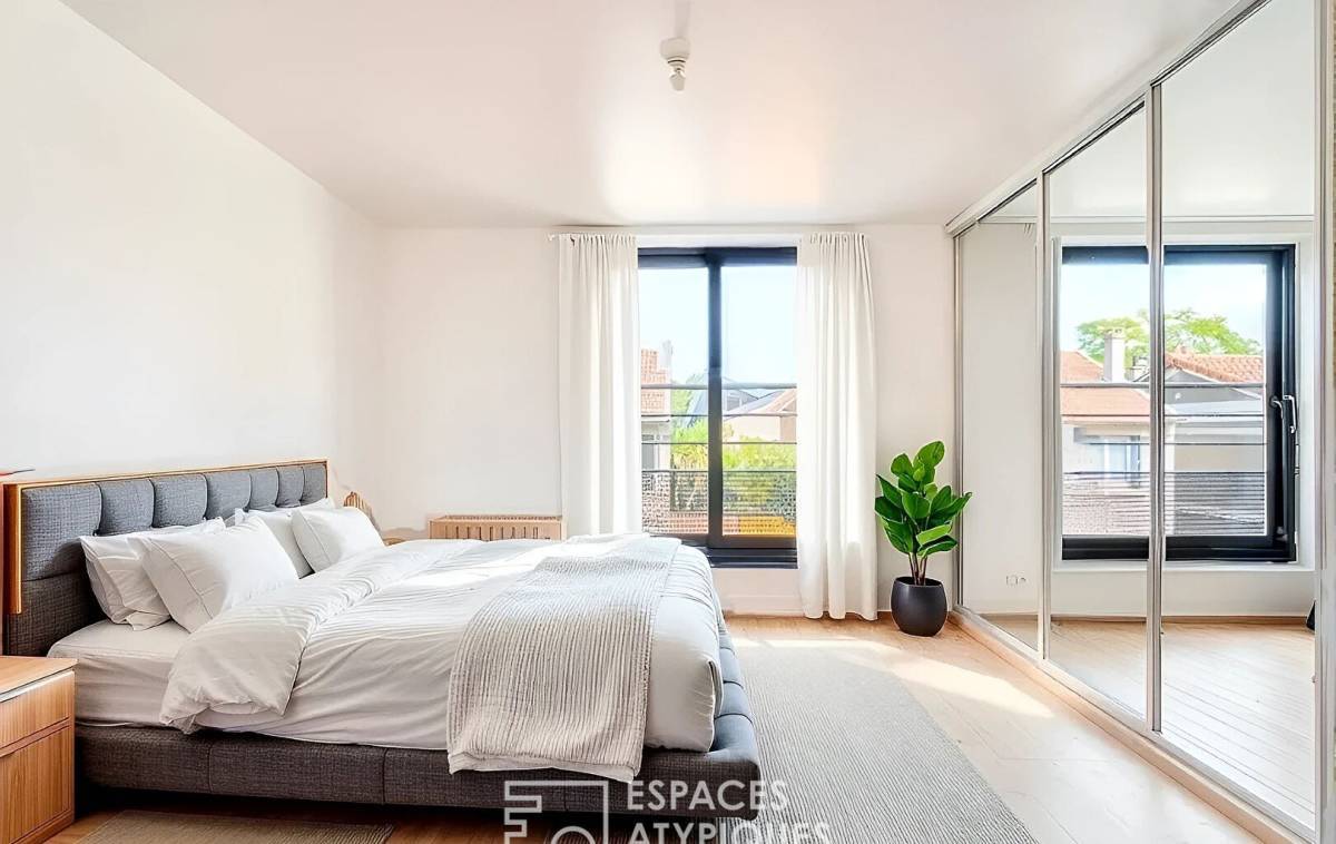 Under a glass sky, the third bedroom, a true suspended cocoon filled with light, perfectly embodies the atypical spirit of this timeless loft.