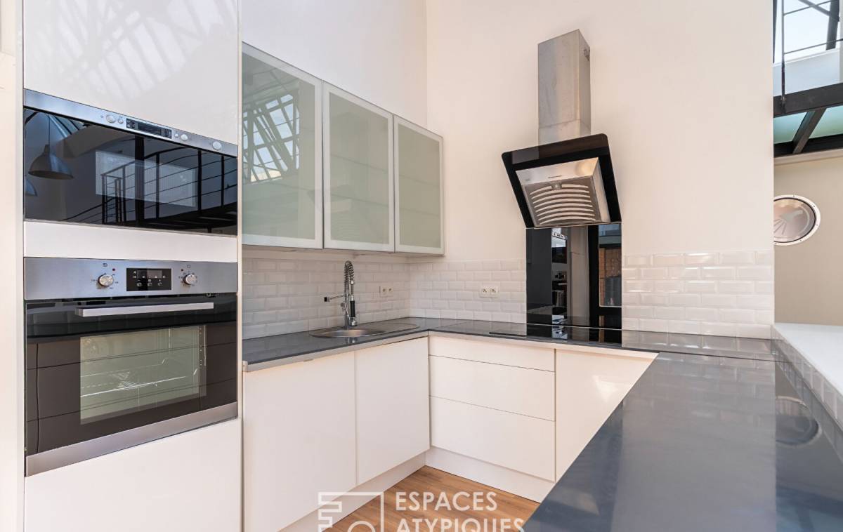 At the heart of the loft, the 76 sqm living area unfolds with impressive volumes. Its partially opening workshop-style glass roof diffuses a soft, constant light, highlighting every architectural detail. Much more than a simple living room, this exceptional space is a genuine stage for life. Its welcoming atmosphere and modular layout defy convention, allowing for the creation of a majestic lounge and a bright dining area that opens onto a 15 sqm terrace. Also accessible from the kitchen, the terrace naturally extends indoor life outdoors, ideal for quiet moments in the sun.