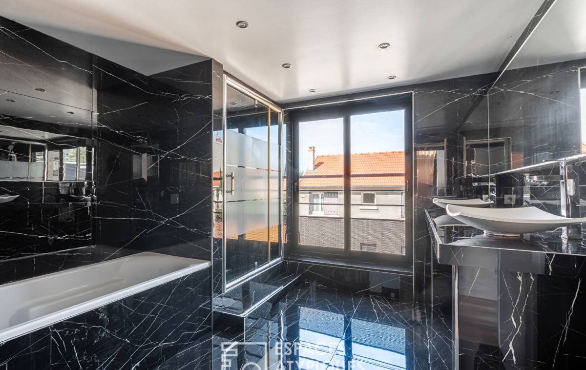 The ground floor houses two bedrooms with Japanese sliding doors, each featuring a built-in dressing room, combining elegance, practicality, and serenity. A spacious bathroom brings together a bathtub and a walk-in shower in a soothing atmosphere. A separate toilet completes this level.