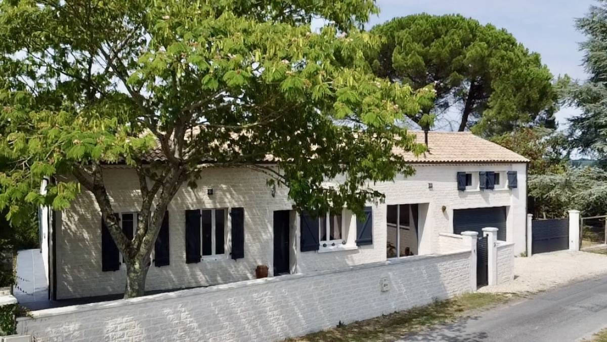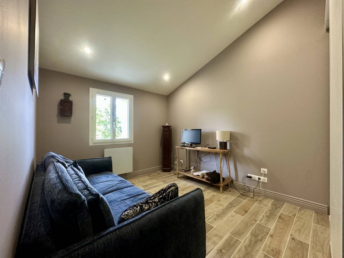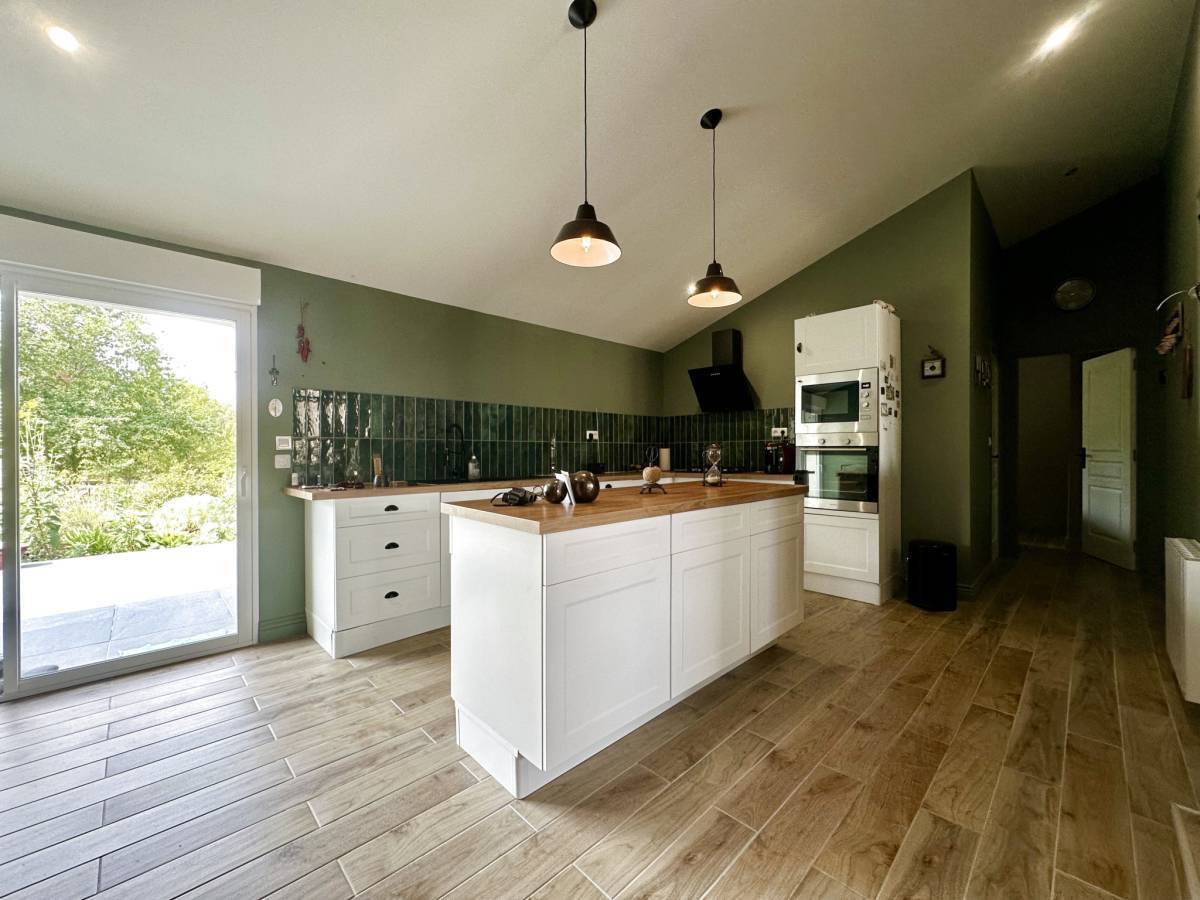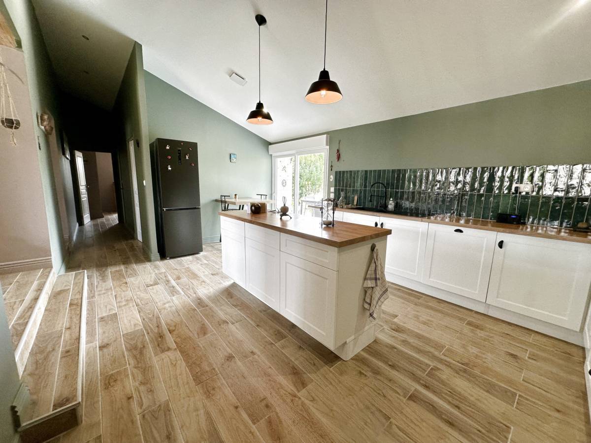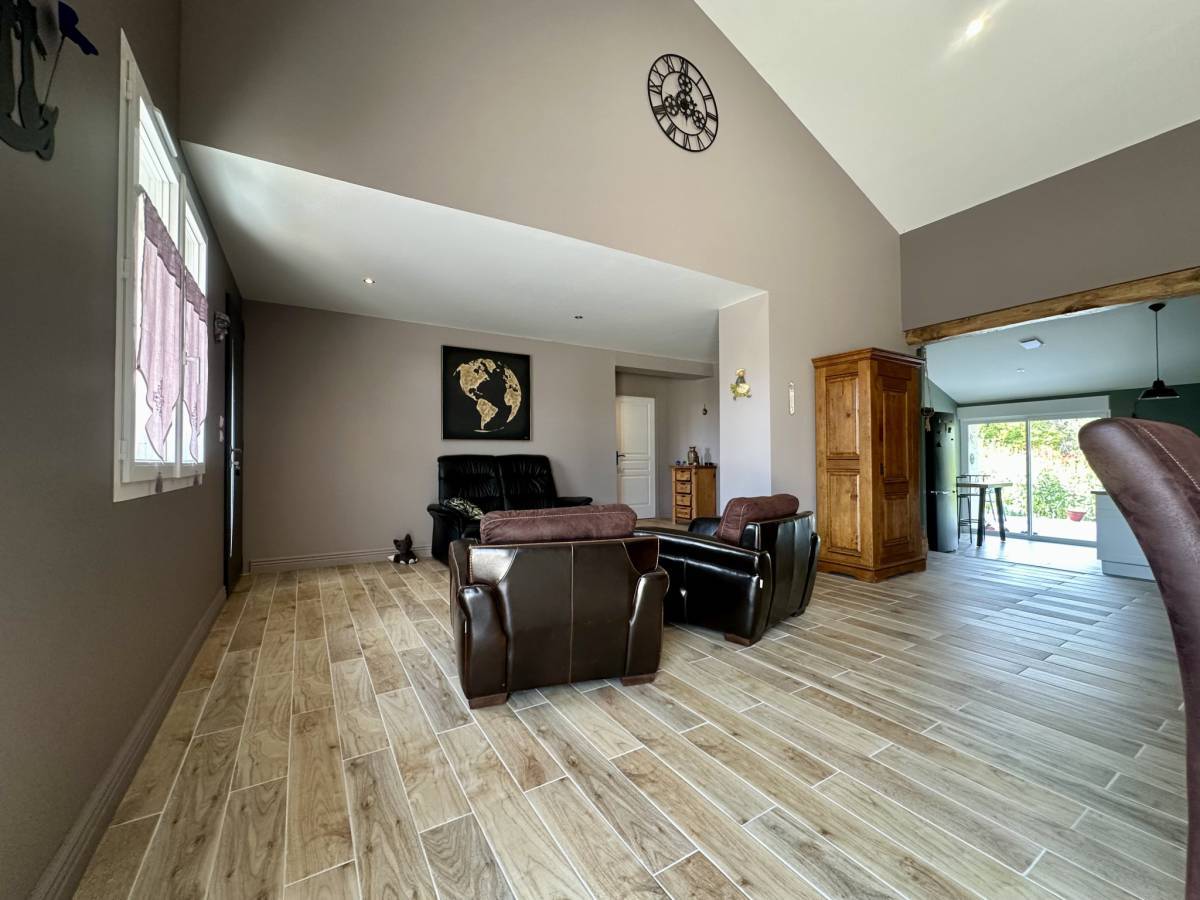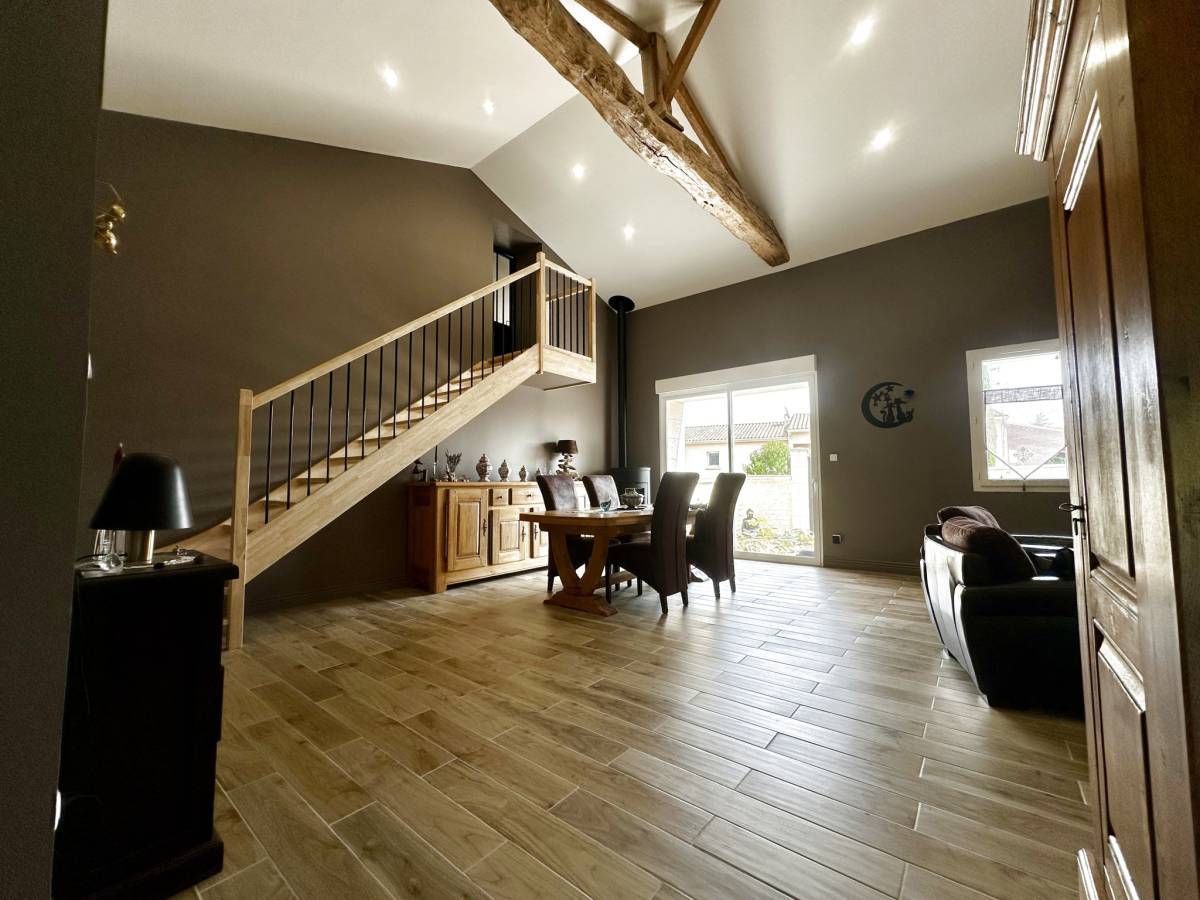 JONZAC (17) - Just 5 minutes from the center of Jonzac, in a peaceful setting, this 160 m2 stone house seduces with its generous volumes and layout. It underwent a complete and careful renovation in 2022. On one level, it offers a large, bright 45 m2 living room, warmly decorated with a pellet stove.