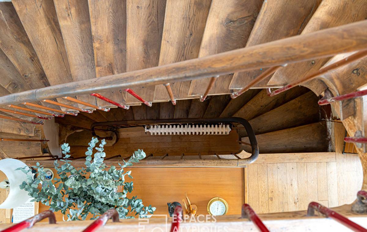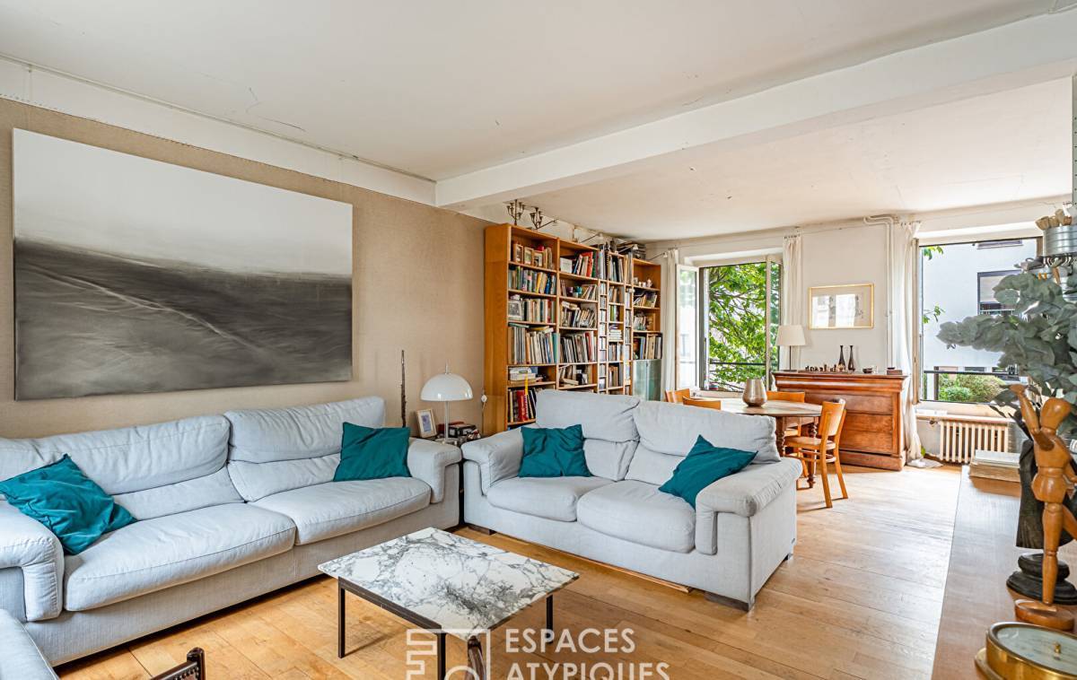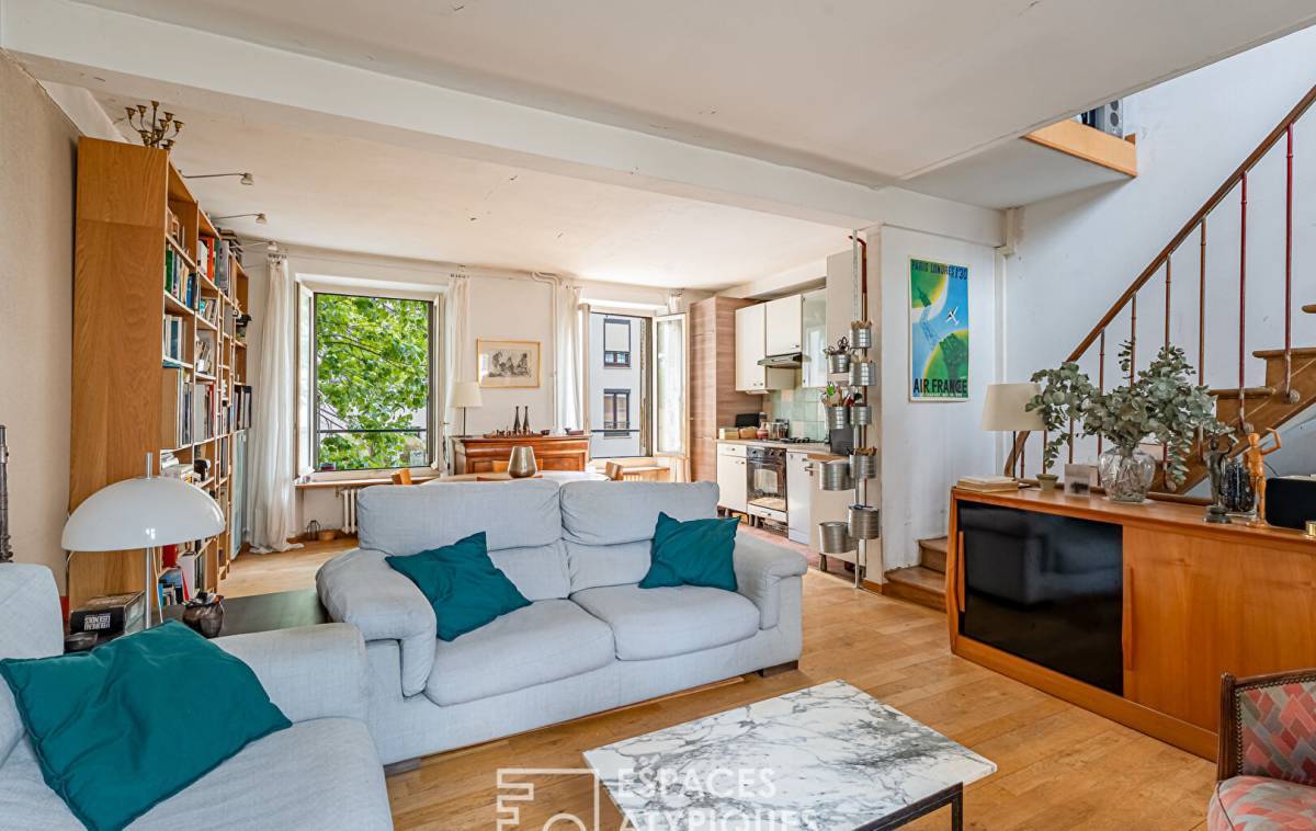Spread over three main levels, the house is structured around a beautiful antique wooden staircase, a common thread between the floors. The ground floor has a separate entrance, while on the first floor, the heart of the house is revealed through a 36 m² dual-aspect living room, bathed in light, combining the living room, dining room, and open-plan kitchen. The living room opens onto a 23 m² terrace awaiting development, for which planning permission has already been granted. The second floor houses two 11 m² bedrooms and a recently renovated bathroom. The attic, converted into a sleeping area, completes the ensemble. Additionally, a vast 43 m² basement with several cellars provides valuable storage space.