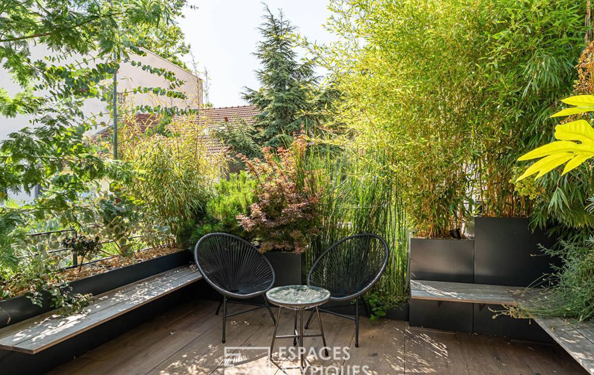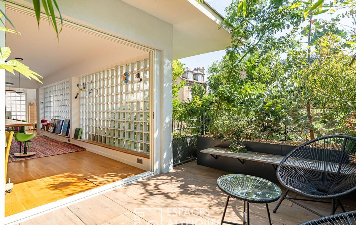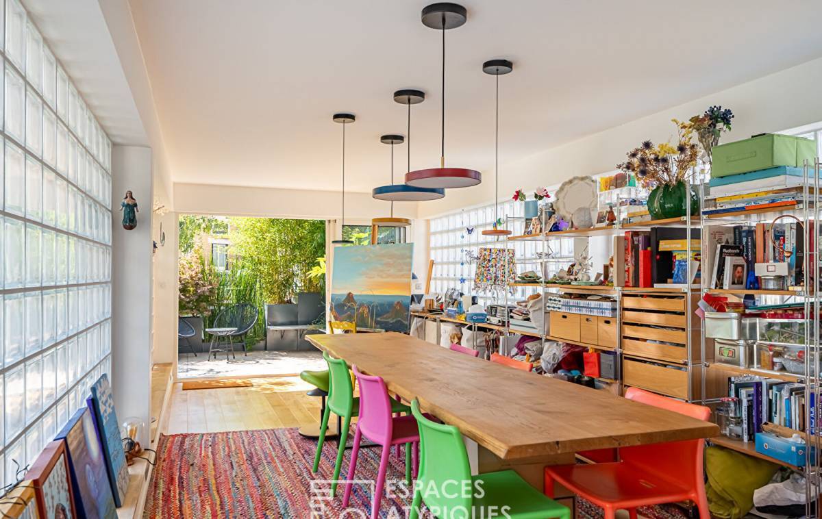 On the top floor, a vast workshop, surrounded by glass bricks, captures light throughout the day. Designed as a true artist's studio, this space inspires with its brightness, its spaciousness, and its timeless atmosphere. Ideal for creativity, it can also be converted into a master suite or a fourth bedroom. It opens onto a suspended terrace, a secret garden perched hidden from view.