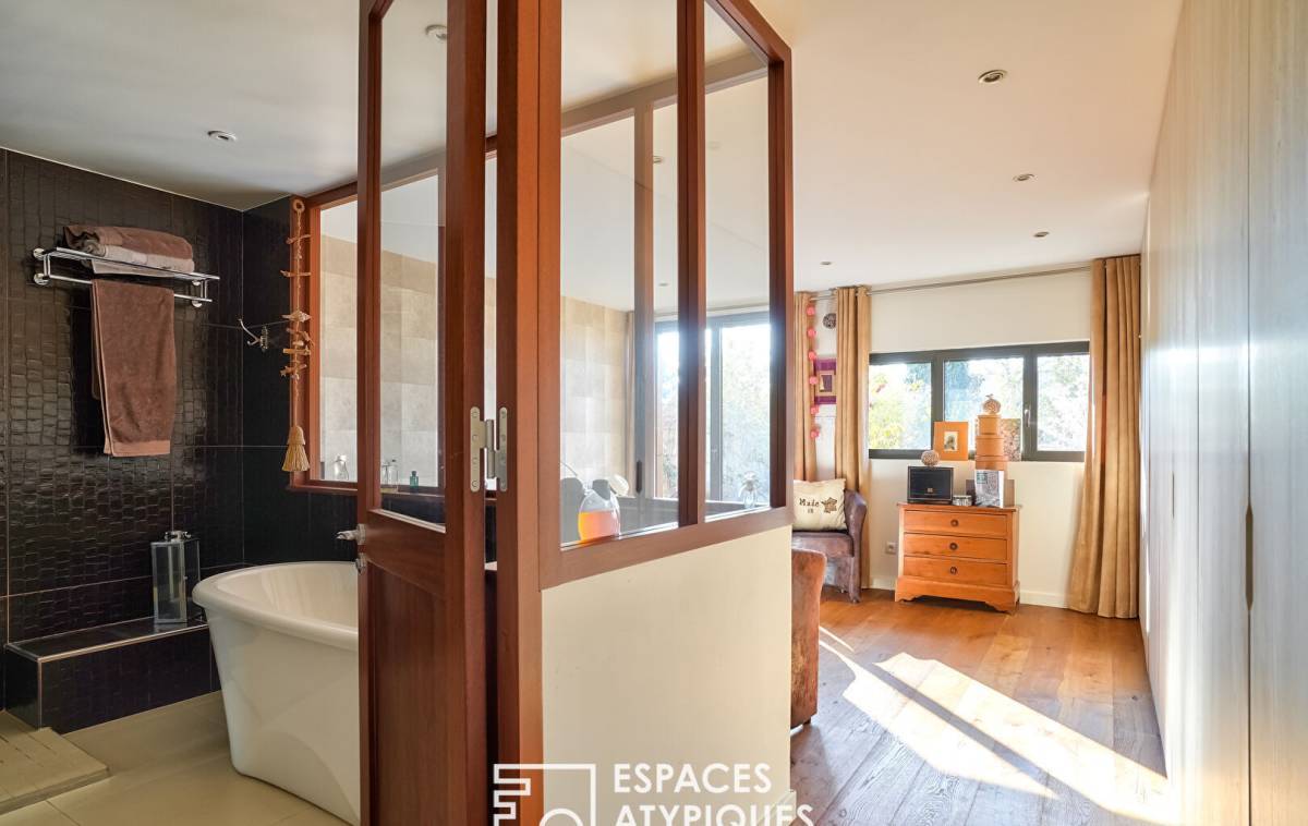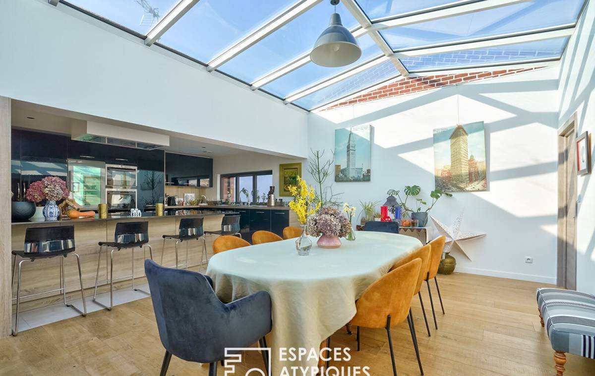 In the sought-after Hoche neighborhood, located on the 2nd and top floor of a gated and secure residence, this 144m² (Carrez law) loft, redeveloped from a former marble factory, captivates with its industrial character, its glass roof, and its 100m² (1,184 sq ft) west-facing rooftop terrace.
