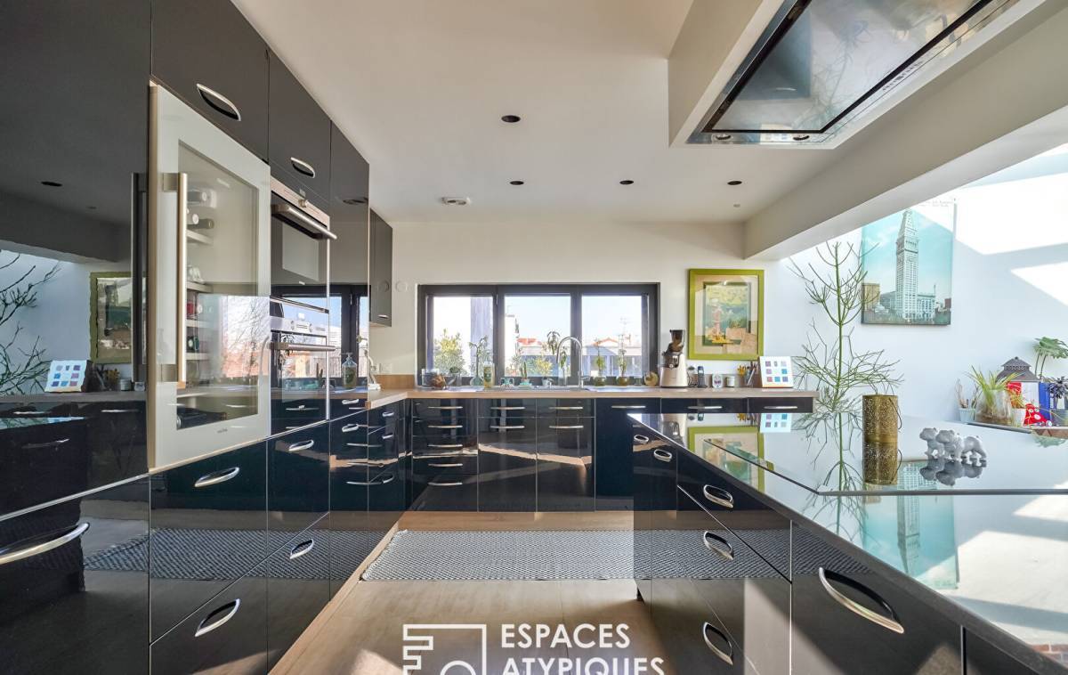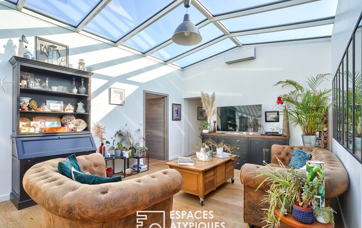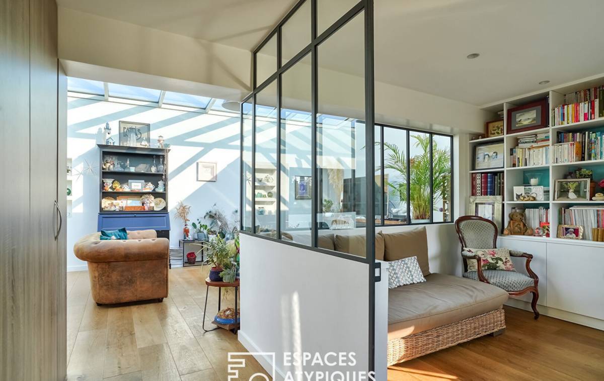 In the sought-after Hoche neighborhood, located on the 2nd and top floor of a gated and secure residence, this 144m² (Carrez law) loft, redeveloped from a former marble factory, captivates with its industrial character, its glass roof, and its 100m² (1,184 sq ft) west-facing rooftop terrace.