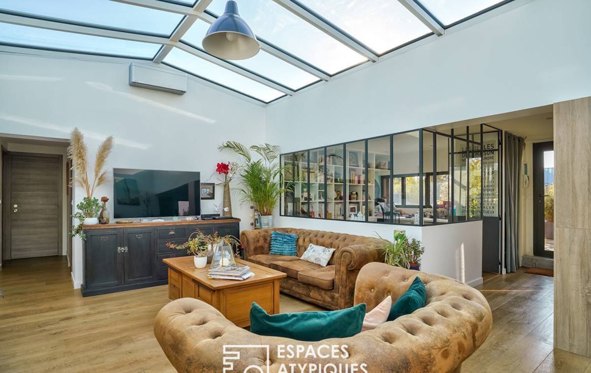 Upon entering, a bright office space opens onto the terrace and creates a seamless visual continuity with the living room thanks to its interior glass roof. The inviting, light-filled living area is centered around a cozy lounge and an open kitchen with a simple, contemporary design.