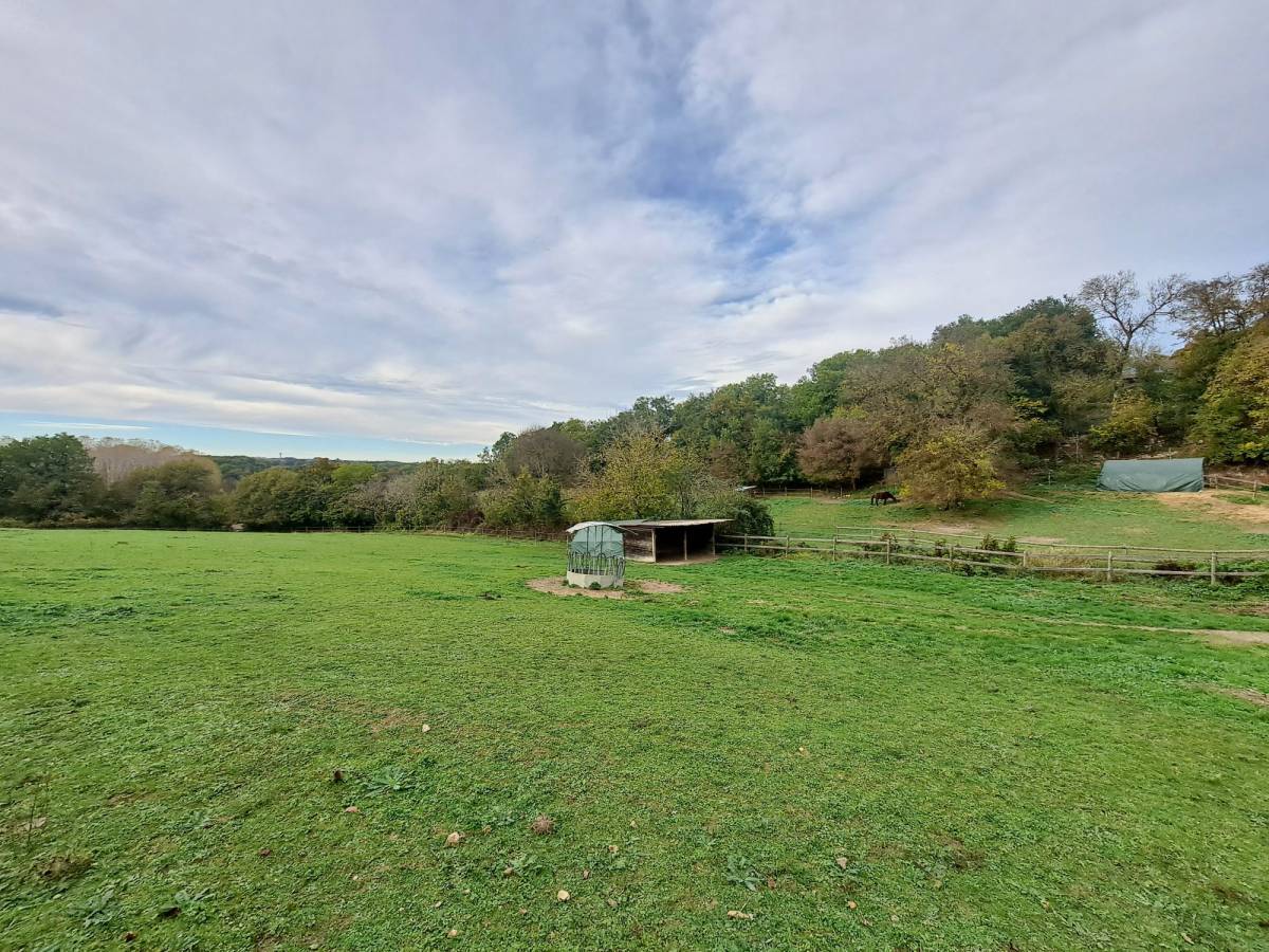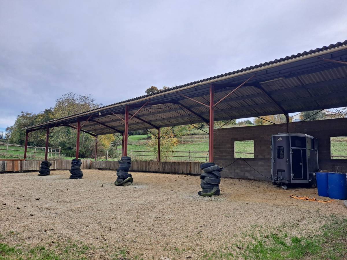 A stable block with 3 boxes and a storage area,A lunging ring and a semi-covered professional riding arena,Four fenced paddocks with wooden barriers and La Sanglière electric fencing,Automatic waterers and wooden shelters in each paddock.The waterers, irrigation system and two toilets are supplied by the property's natural spring, with a buffer tank and booster pump system.
