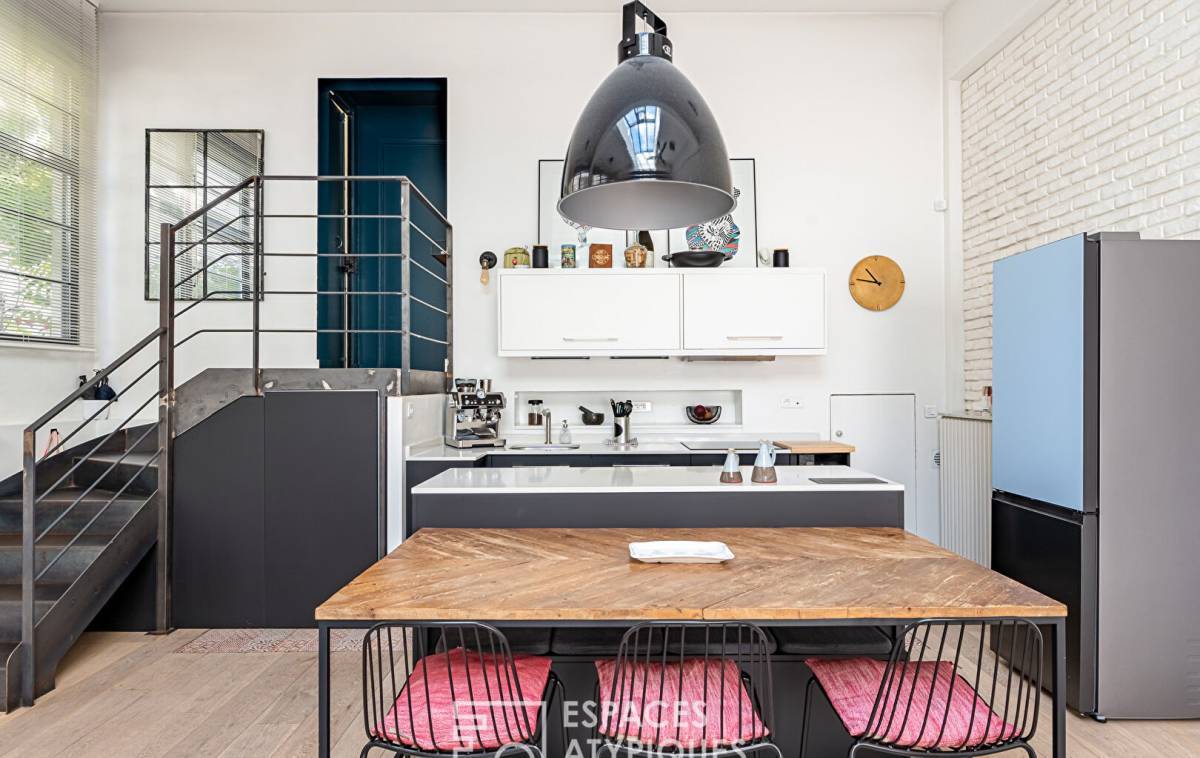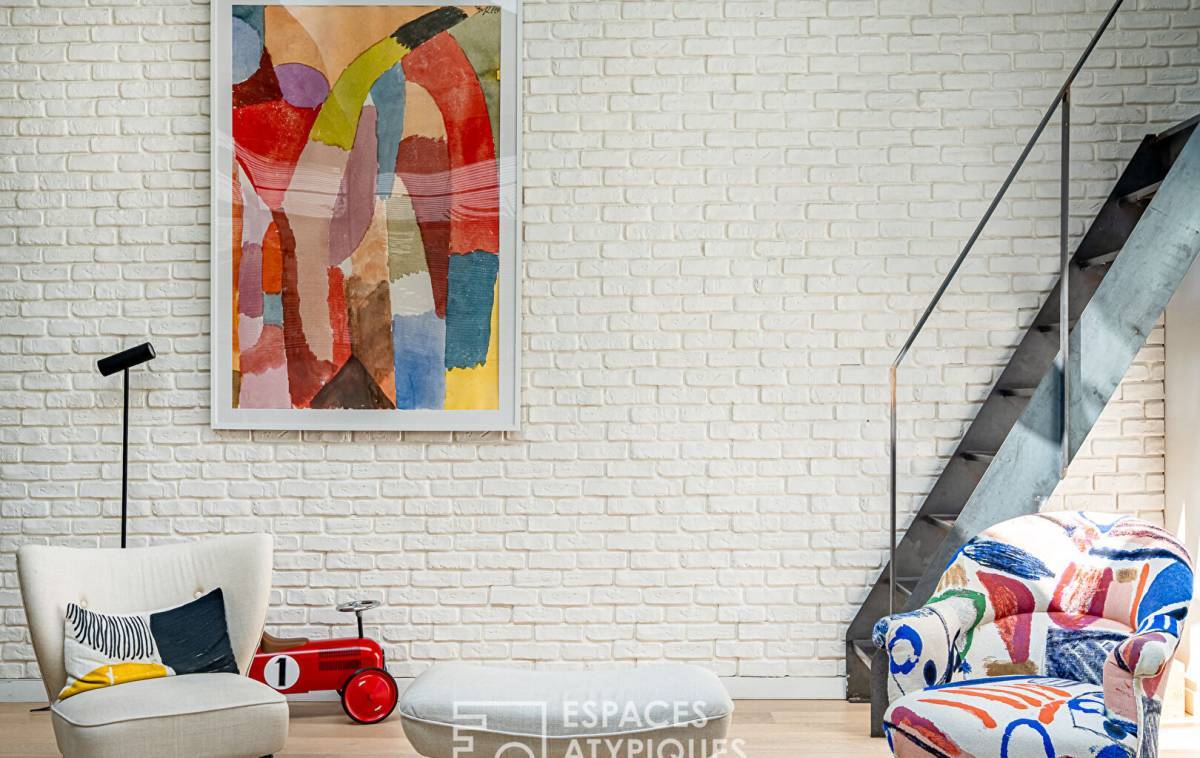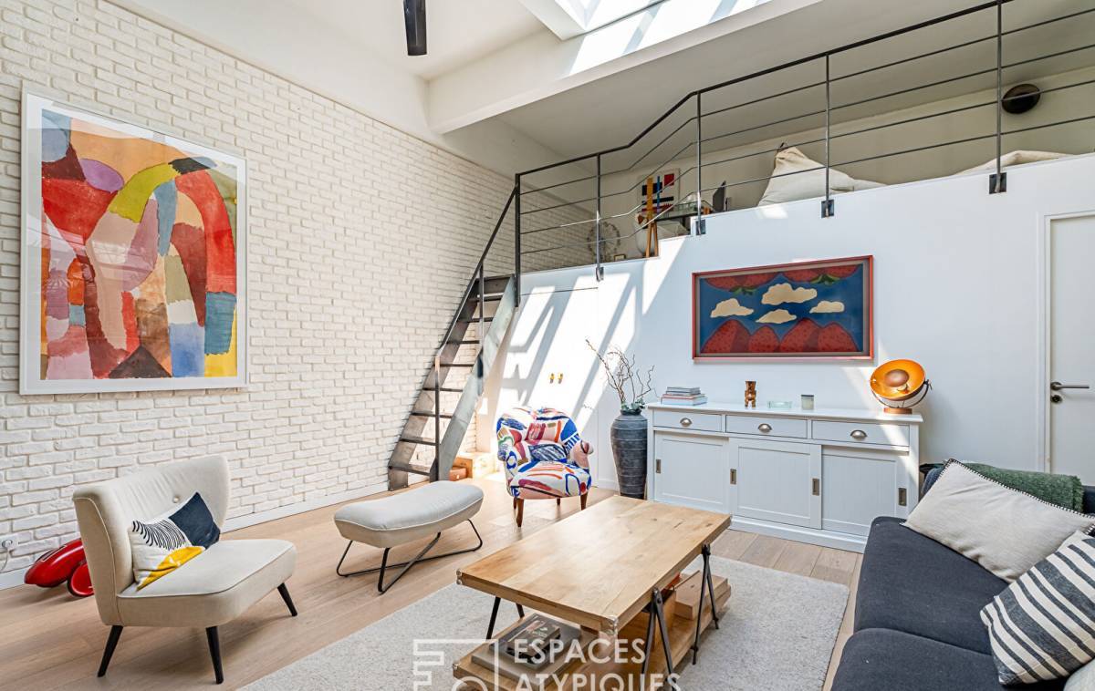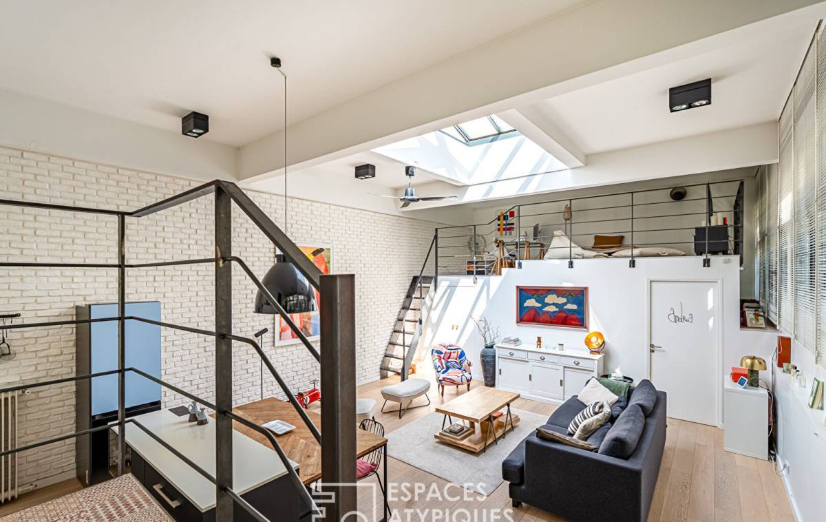 The fully open-plan living space and its 3.90-meter ceiling height accentuate the volume. The white brickwork and iron railings give it an industrial feel. The wide glass facade and skylight provide abundant light.