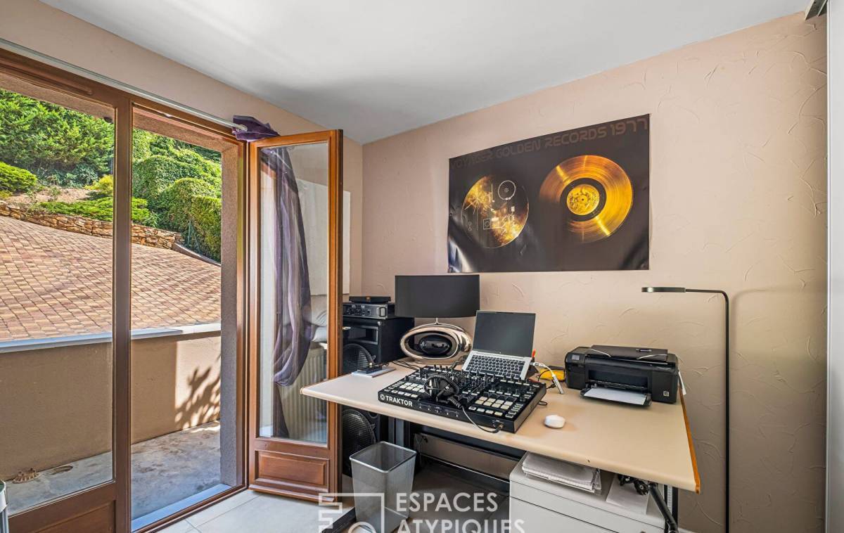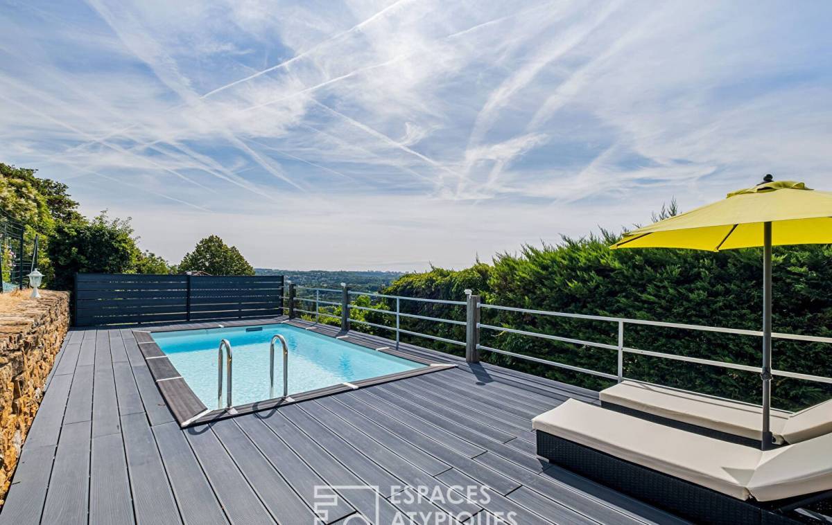 Its elevated position, generous volumes, and abundant natural light make it a rare and distinctive property. Sheltered from view, the landscaped garden, south-facing terrace, and swimming pool create a harmonious and peaceful setting.