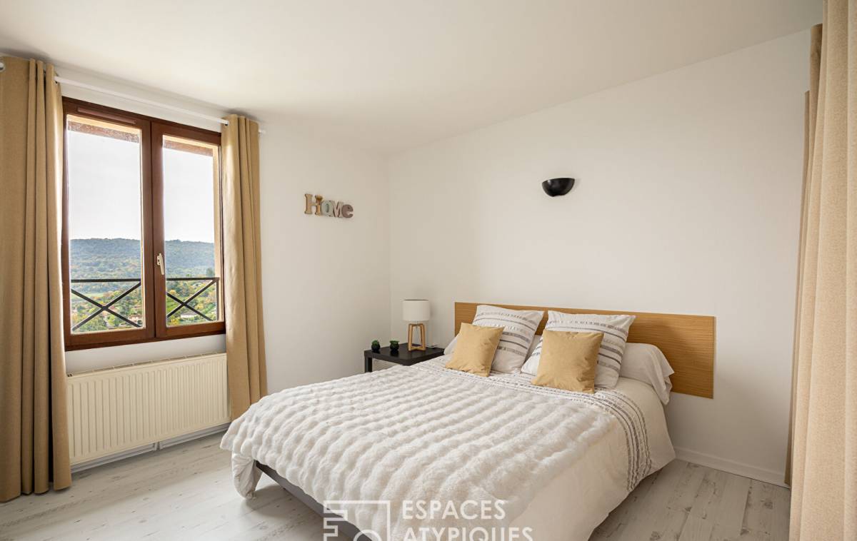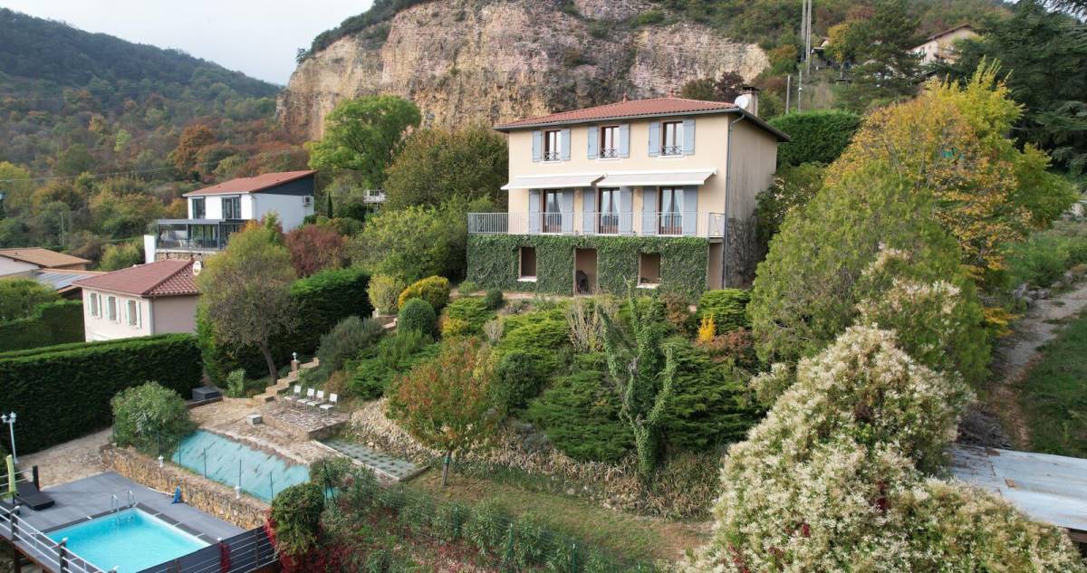 Its elevated position, generous volumes, and abundant natural light make it a rare and distinctive property. Sheltered from view, the landscaped garden, south-facing terrace, and swimming pool create a harmonious and peaceful setting.