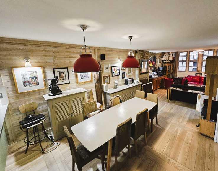 Located in the heart of the historic center of Dinan, this unique half-timbered building with a 15th century medieval charm offers an exceptional living and working environment. Combining residential space and commercial potential, it is ideal for those who wish to combine family life and professional projects in a place steeped in history. A mixed heritage investment project to discover! The ground floor is dedicated to a commercial space, perfectly located for optimal visibility on a street frequented by residents and visitors to the city. This space benefits from an authentic charm that will attract curious customers and passers-by. The rest of the building is structured around a large, bright triplex, designed for family life, with generous and bright living spaces. Particular attention has been paid to the renovation, in an ecological spirit and with noble materials. The triplex includes an open kitchen and a warm living room, as well as a south-facing terrace with a view of the Clock Tower, offering a rare and outdoor space in the heart of the city. The upper floors offer 4 bedrooms, and bathrooms on each floor with dressing room, all in a cozy atmosphere. An adjoining guest house, to renovate, completes this exceptional property. It offers additional potential to enlarge the living space or develop a rental activity. for an additional source of income. This exceptional property is a rare opportunity for those looking to invest in a place full of history, reconciling family life and commercial activity in the heart of Dinan or a heritage investment with its mixed rental yield. (Plans and additional information available on request)