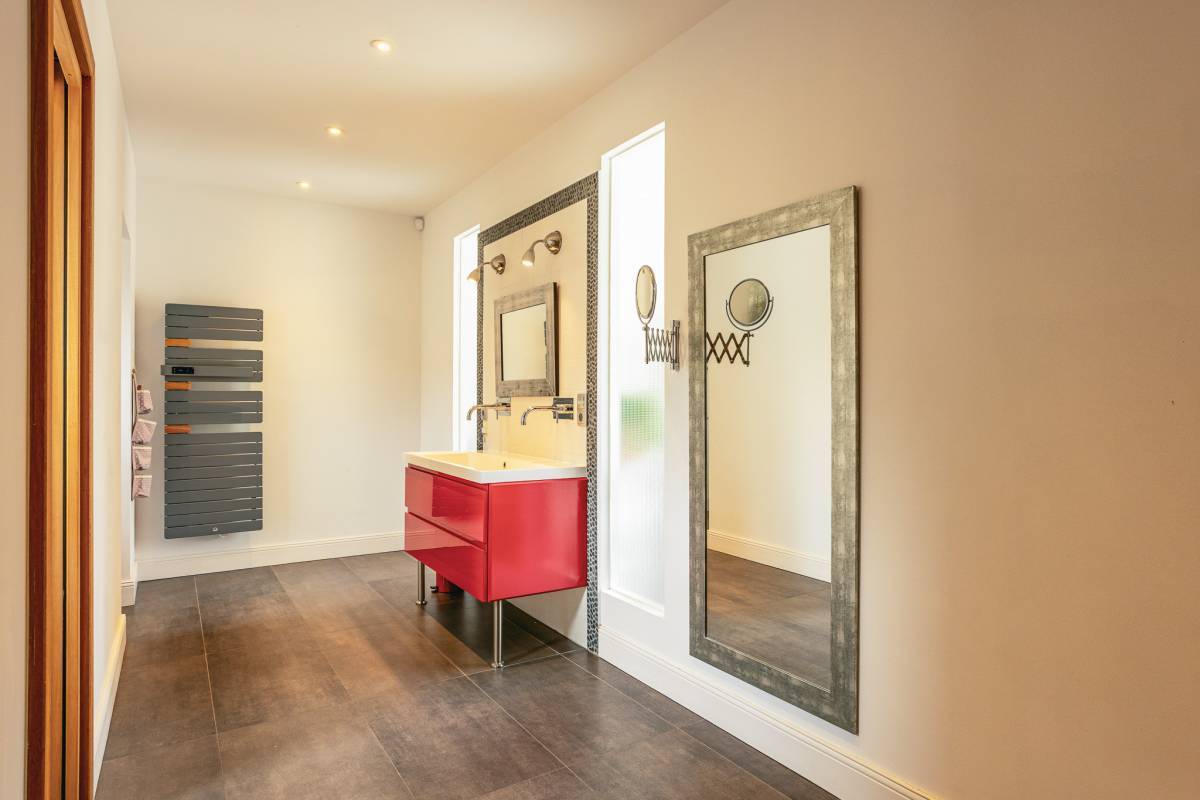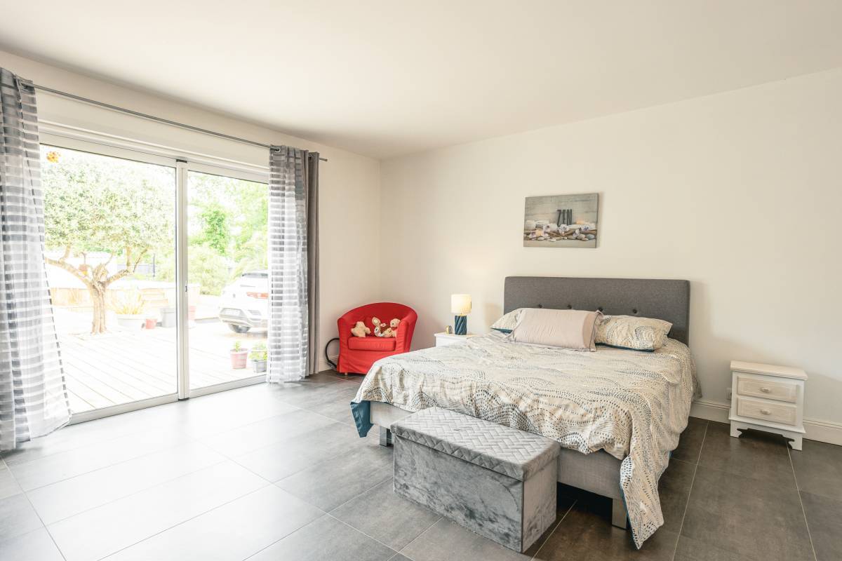 Two master suites, a bedroom, an office, and a utility room complete this level, perfect for entertaining. The upper floor offers access to two additional bedrooms from a mezzanine. A veranda extends the space outside, opening onto a private courtyard and a welcoming terrace.