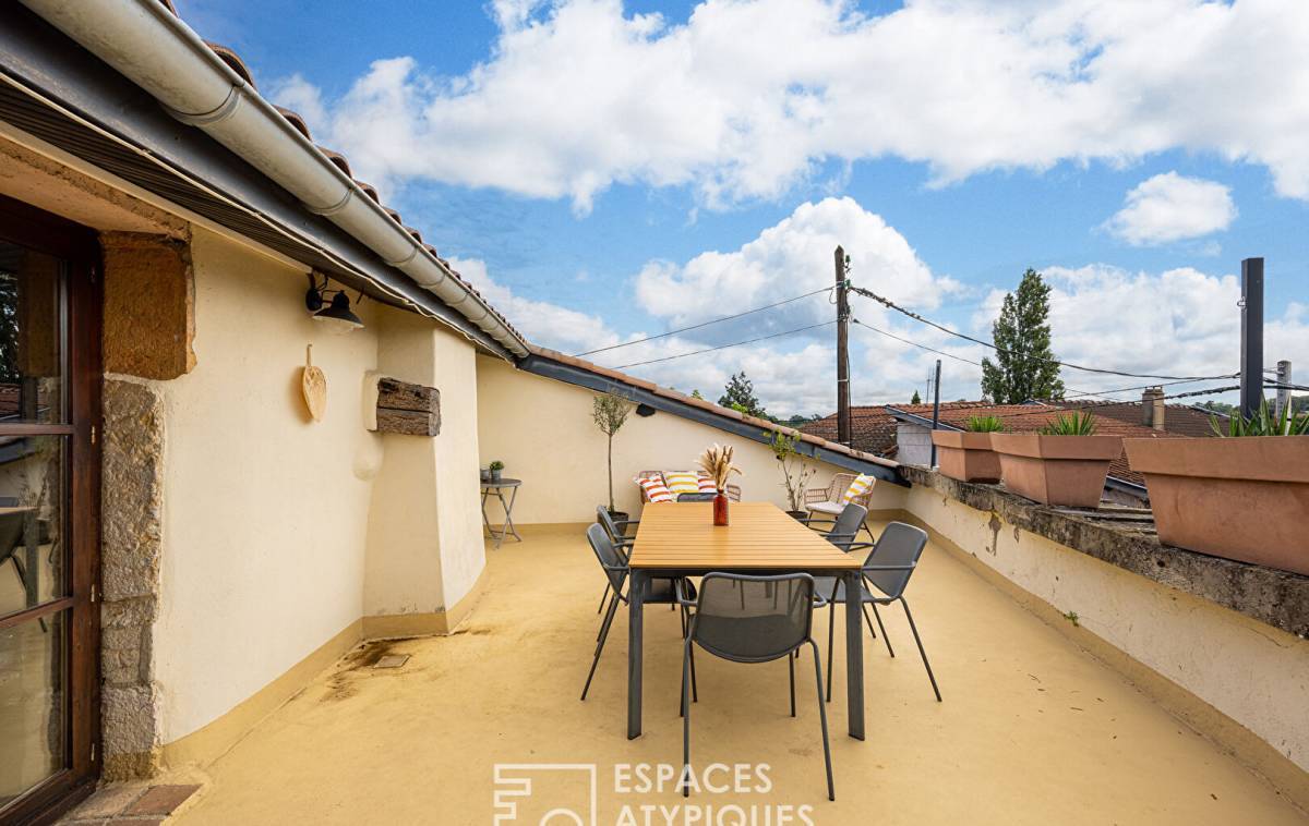 A second bedroom and a bathroom complete this level. A metal staircase leads to two additional bedrooms as well as an office and provides access to a 30 sqm rooftop terrace. The generous volumes, character, and character of this building make it a unique living space.